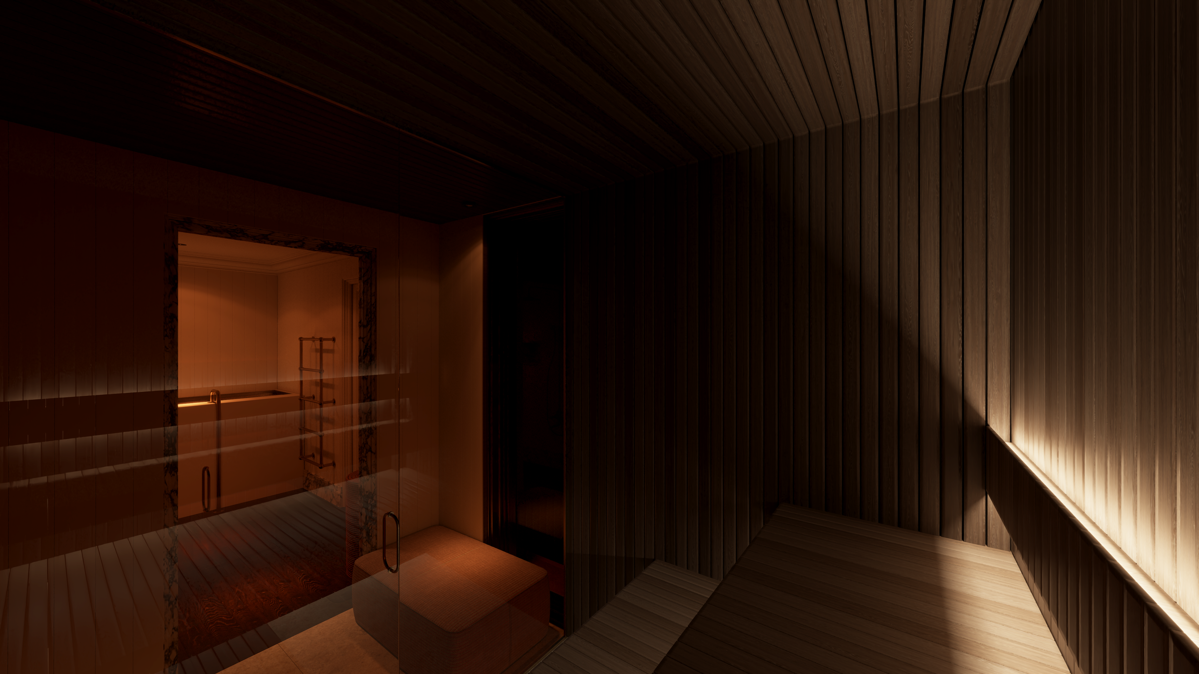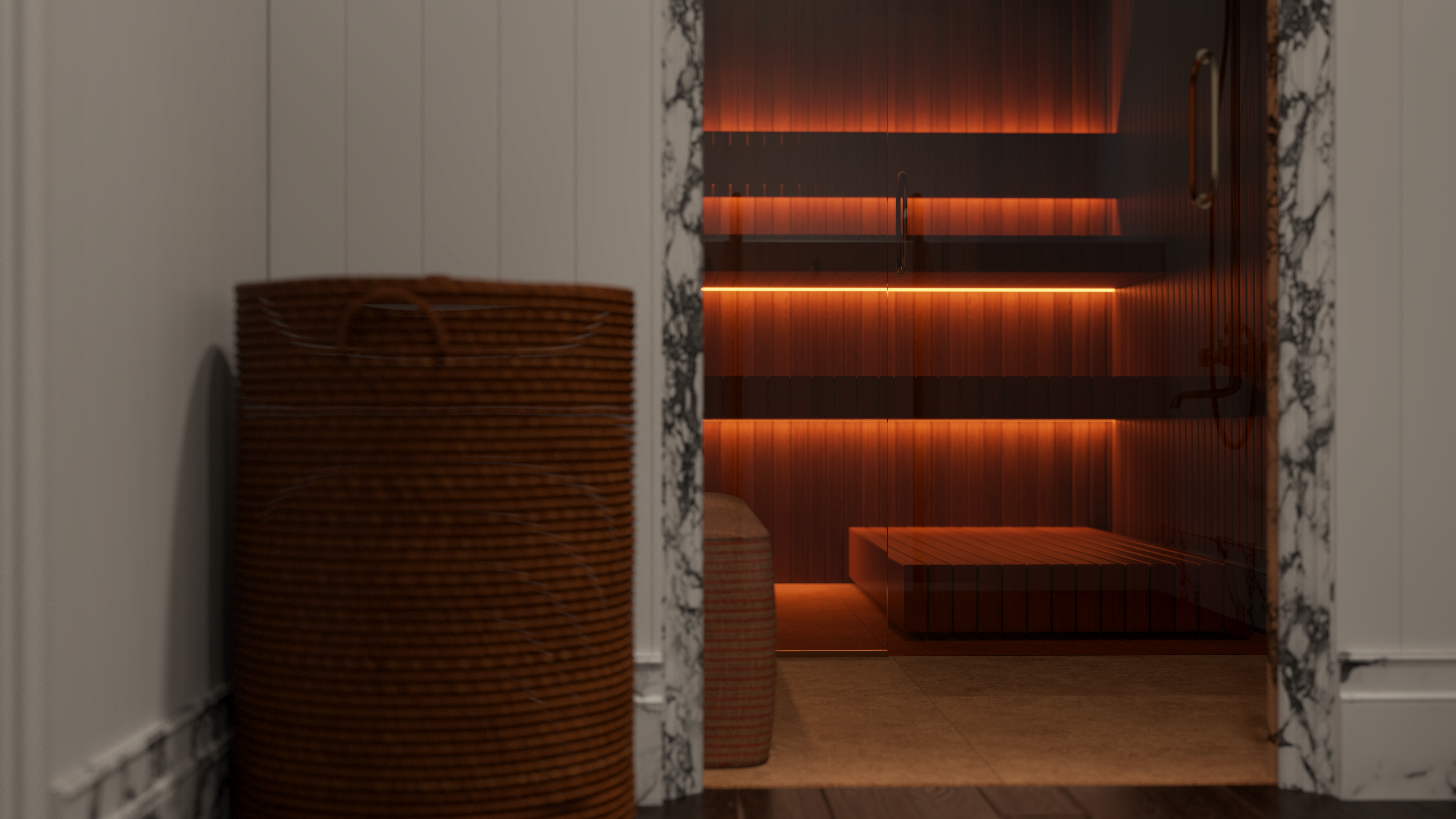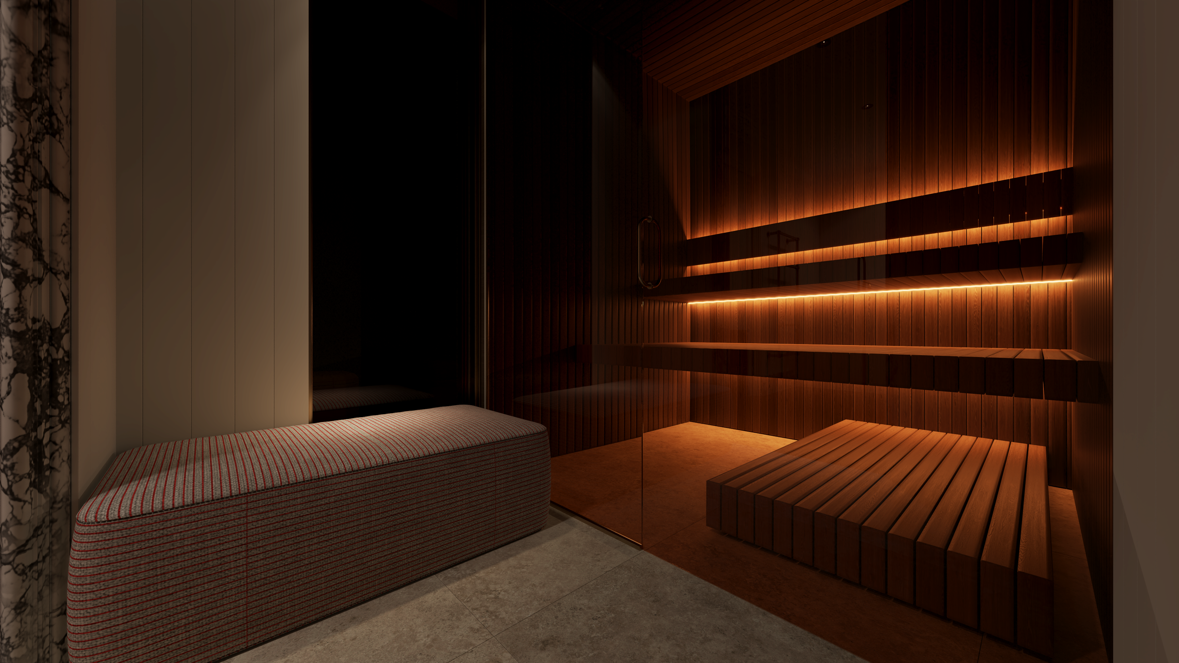 Outside the sauna, a custom upholstered bench provides a dedicated cooling and rest area between sessions.