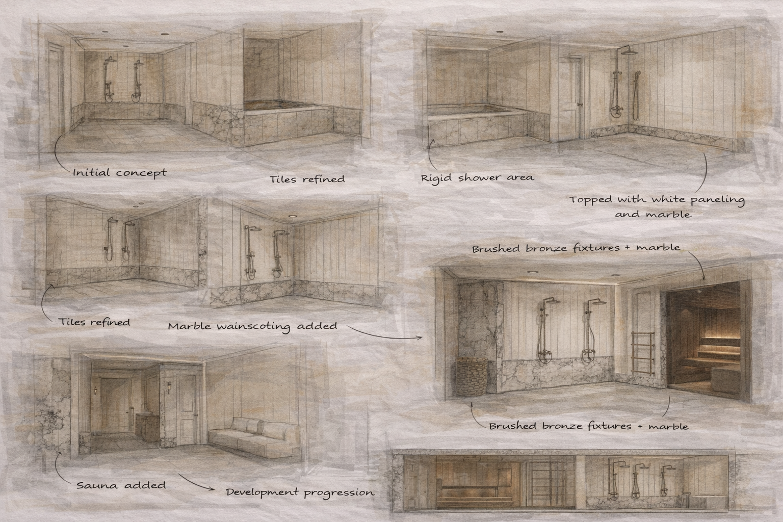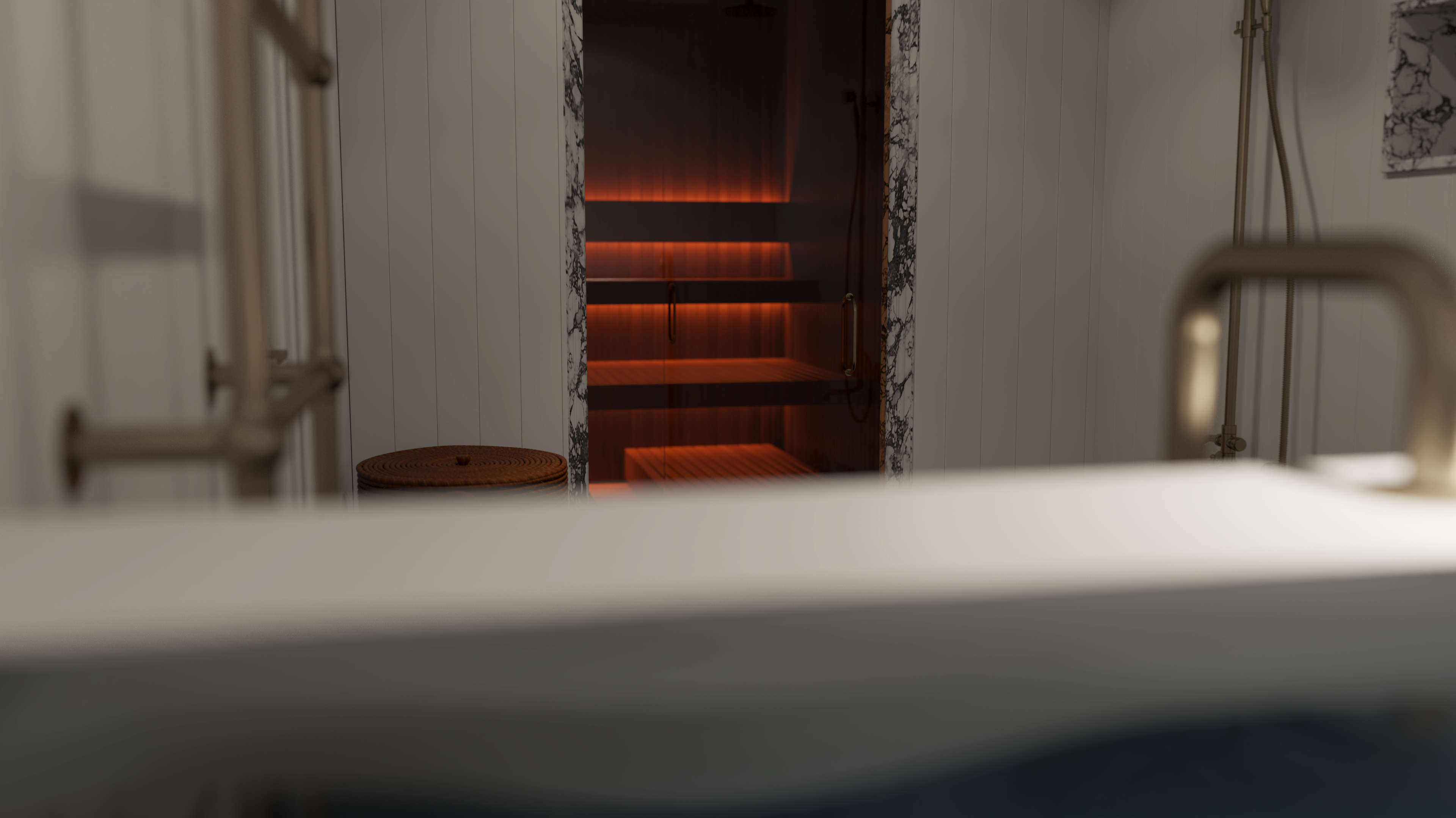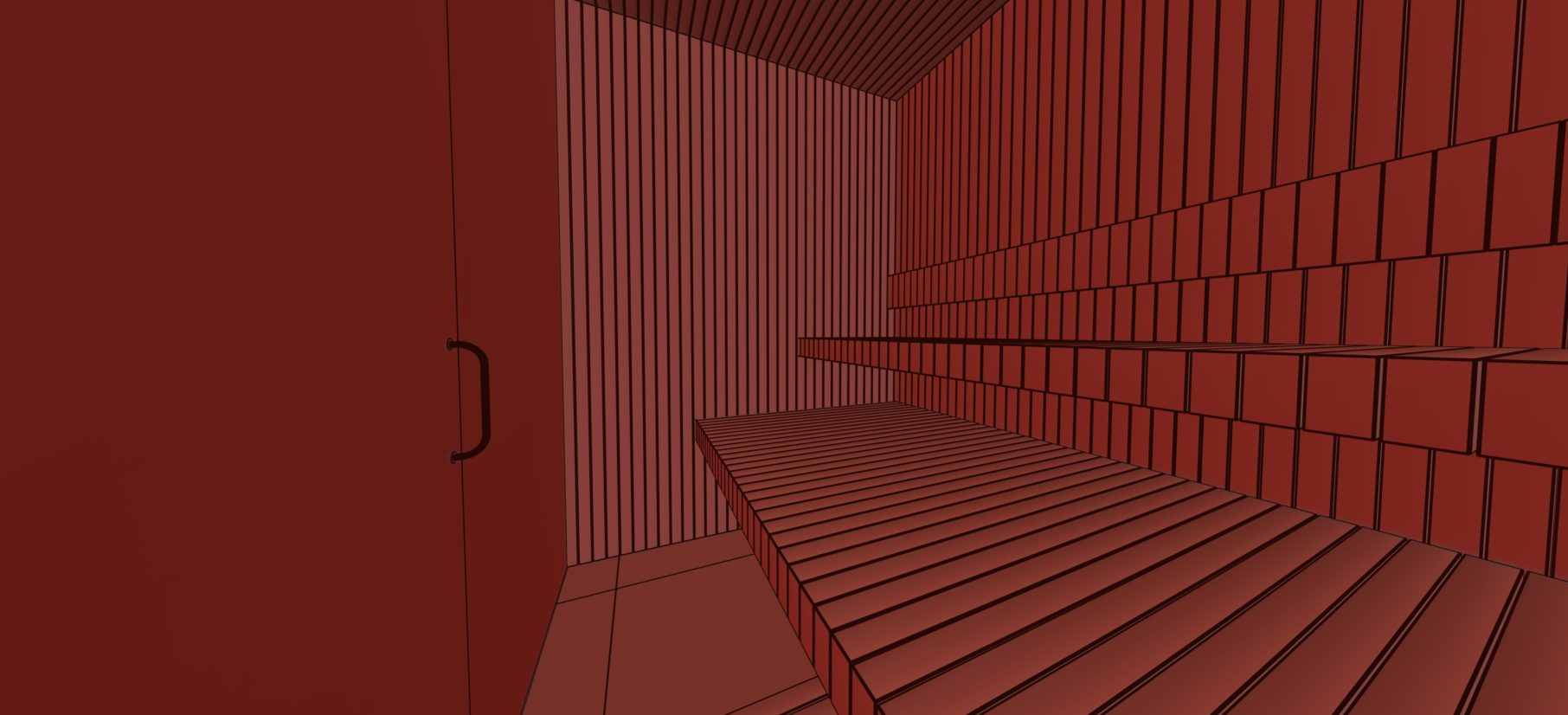 Outside the sauna, a custom upholstered bench provides a dedicated cooling and rest area between sessions.