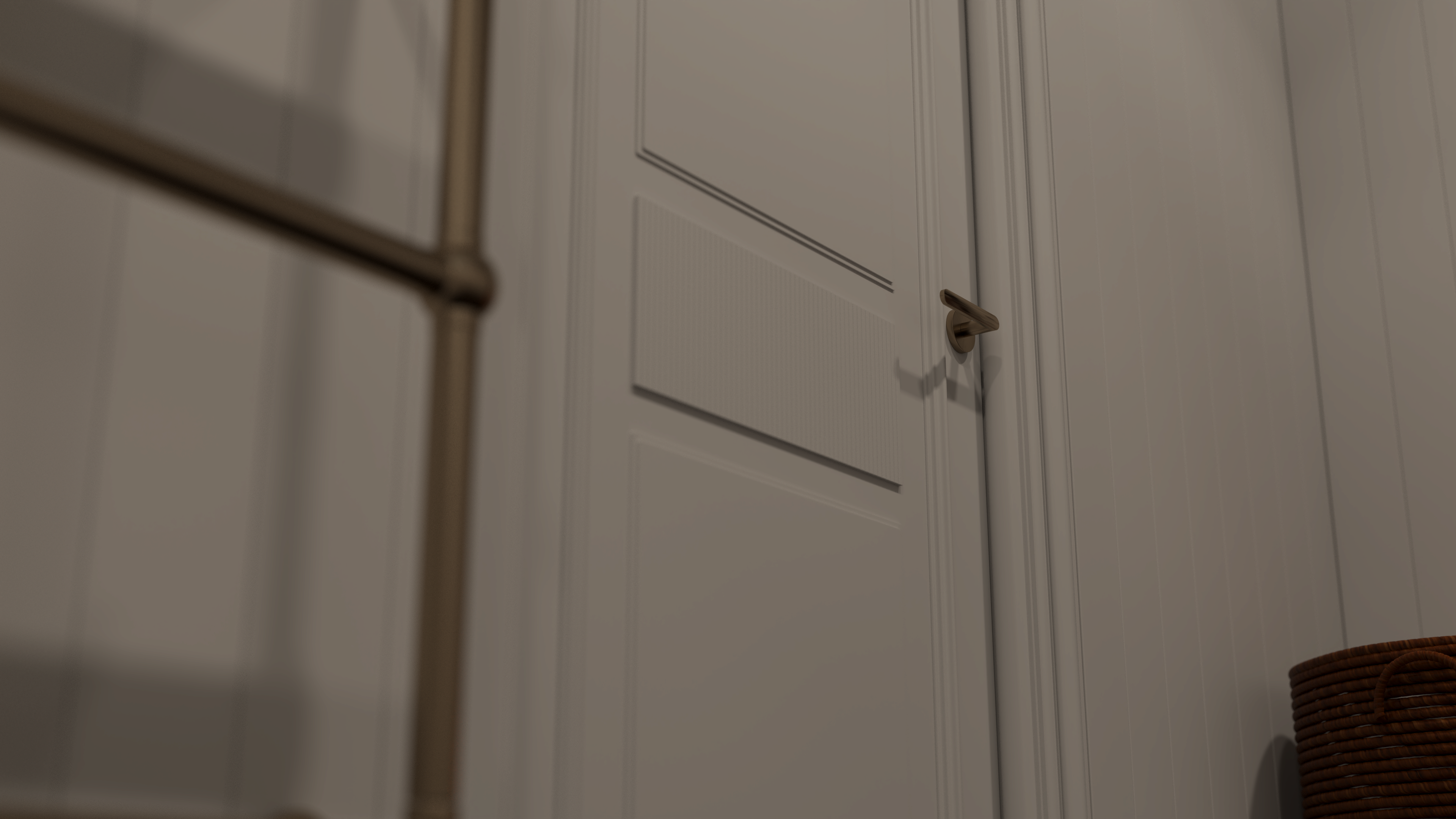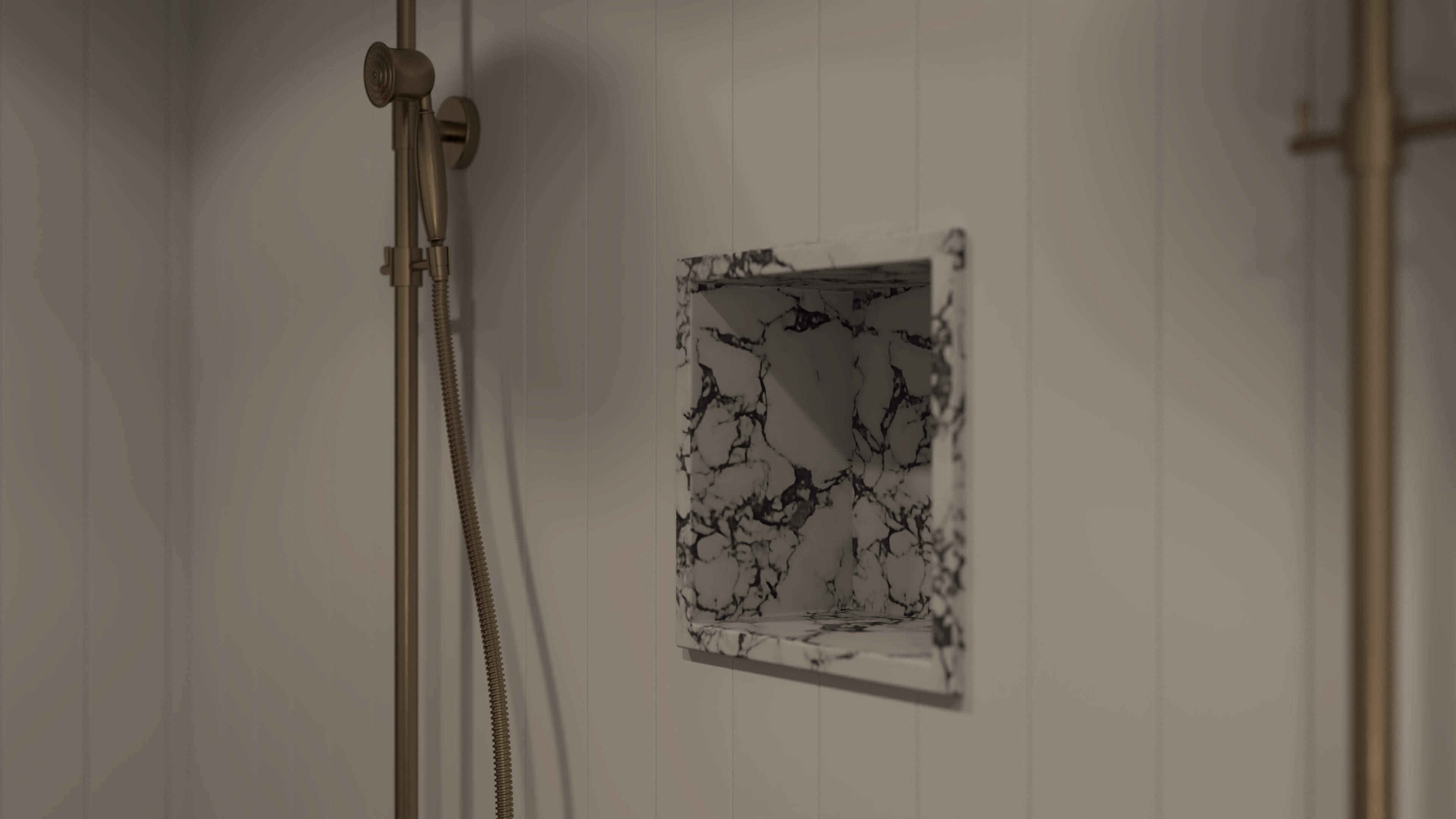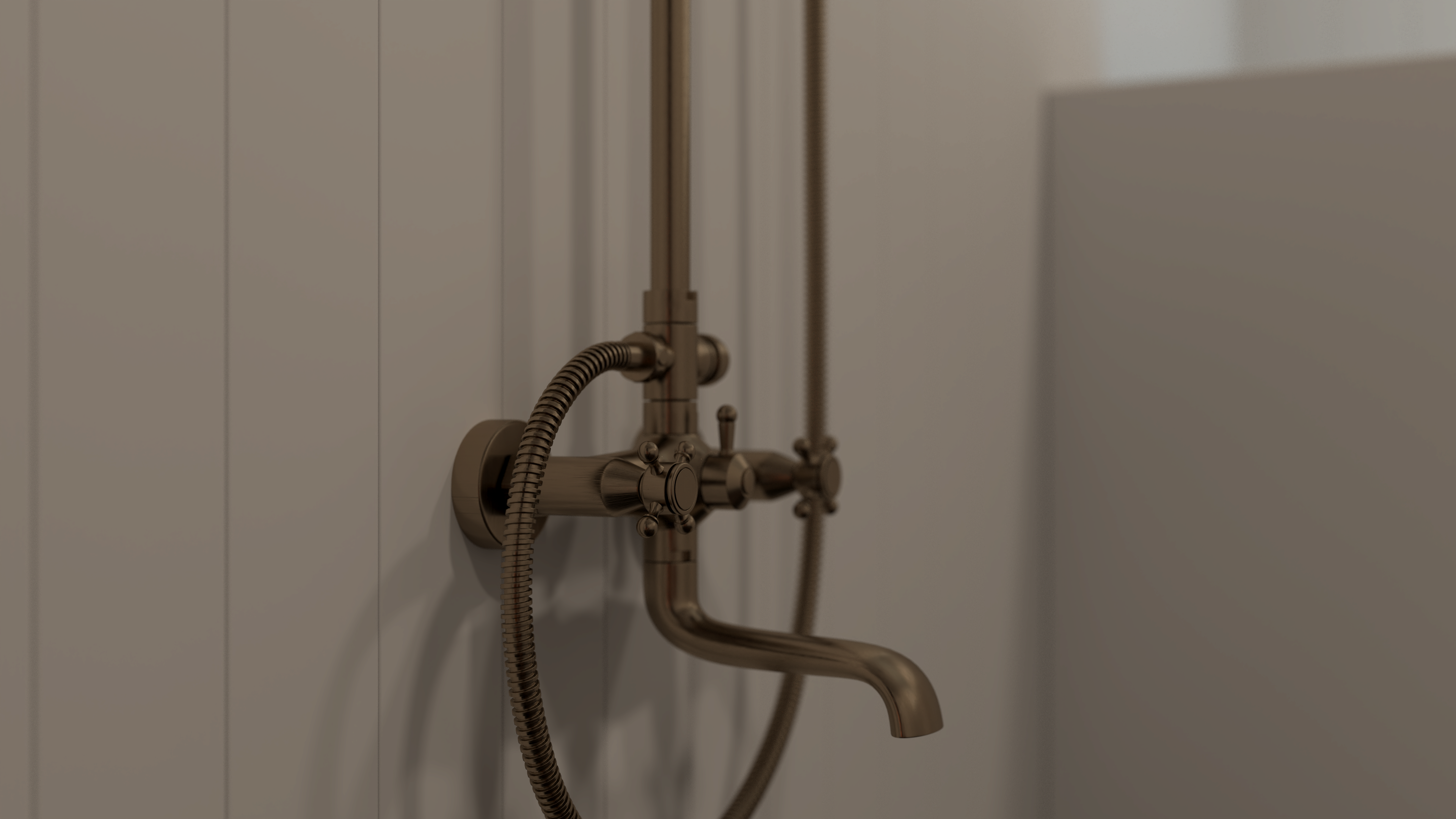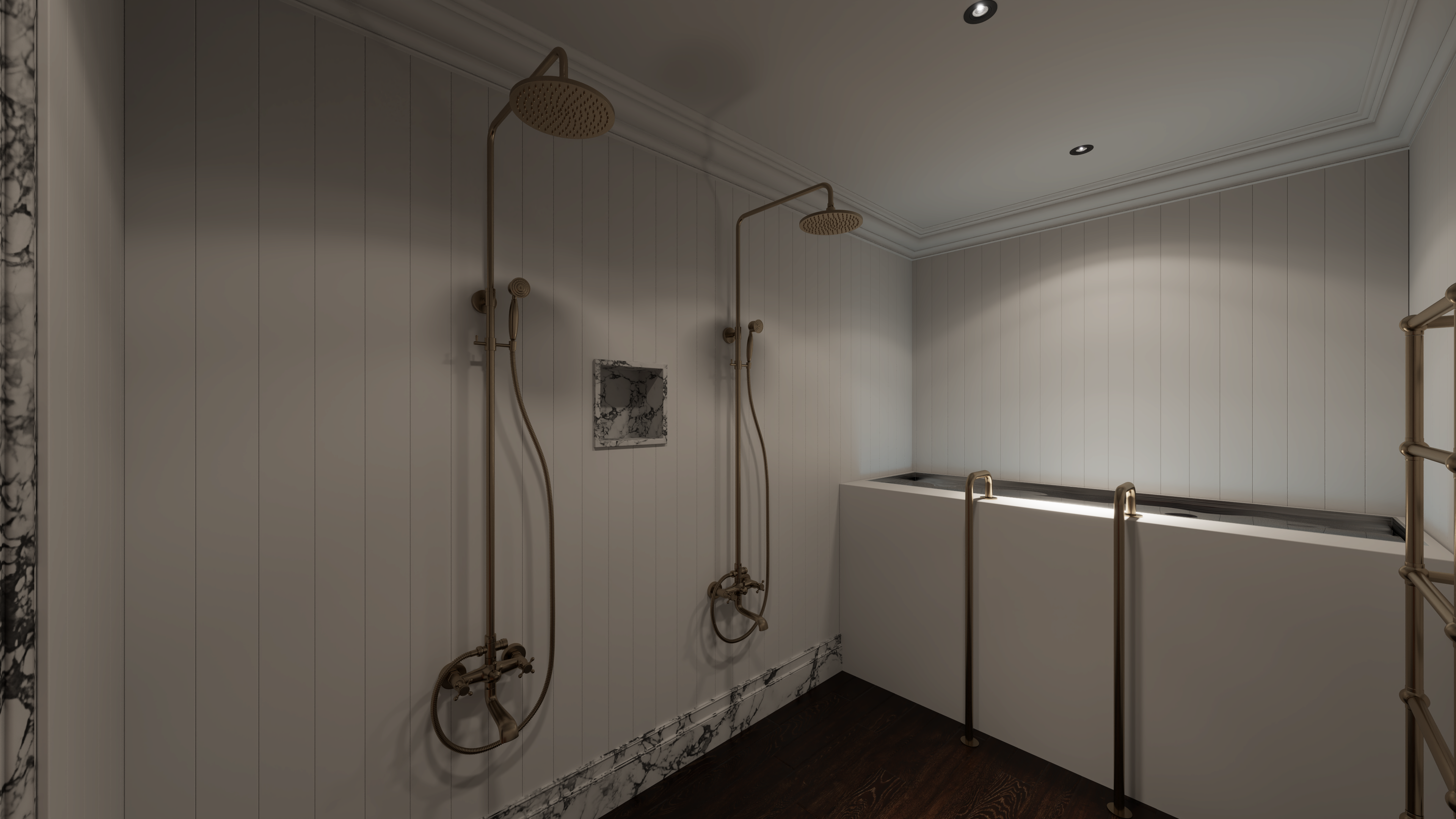 The adjoining bathroom follows a traditional English design language. Wood-effect porcelain tiles bring warmth and durability, paired with solid brass shower fittings and hardware from Drummonds Bathrooms. Marble skirtings and architraves complete the detailing.