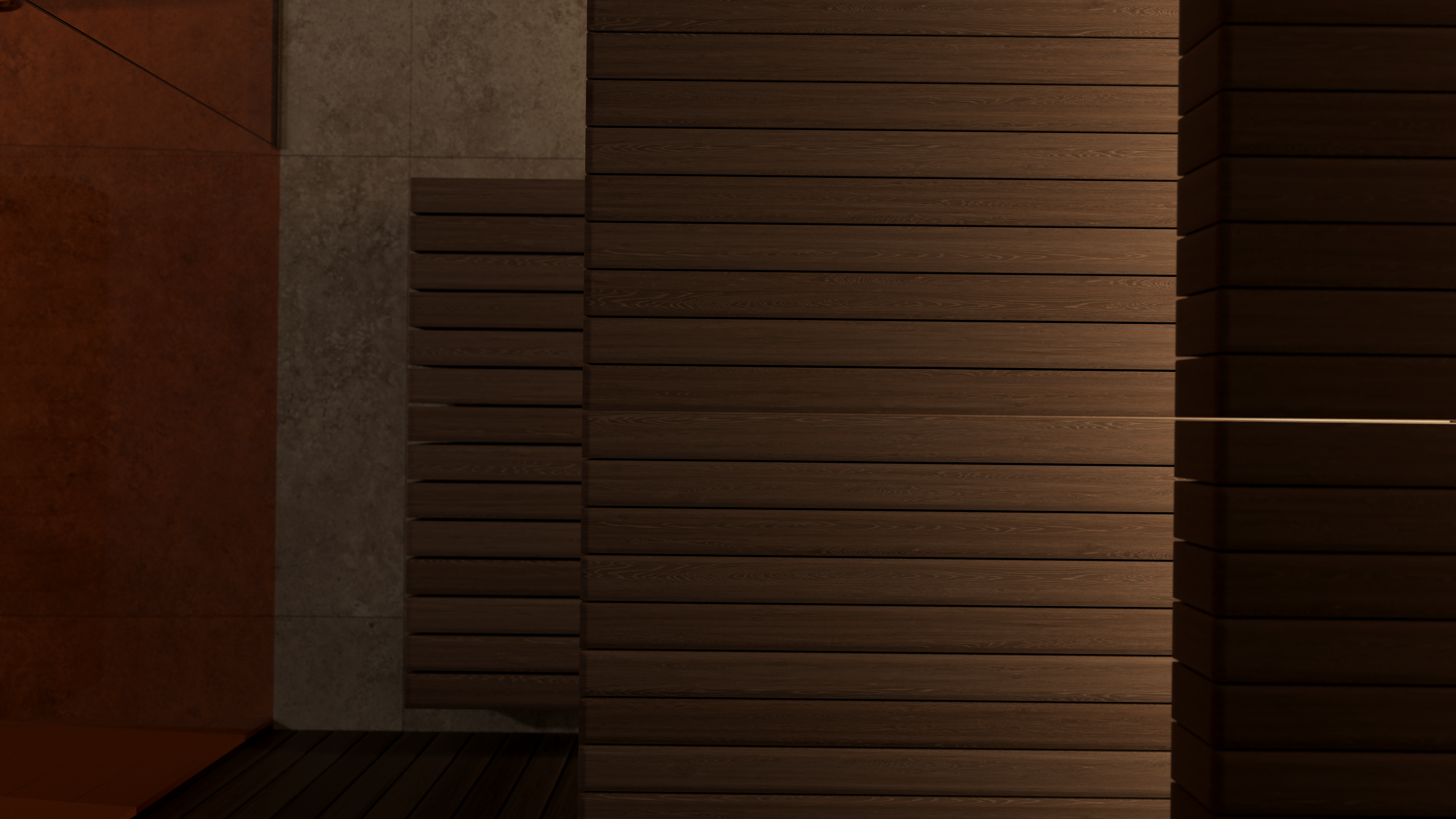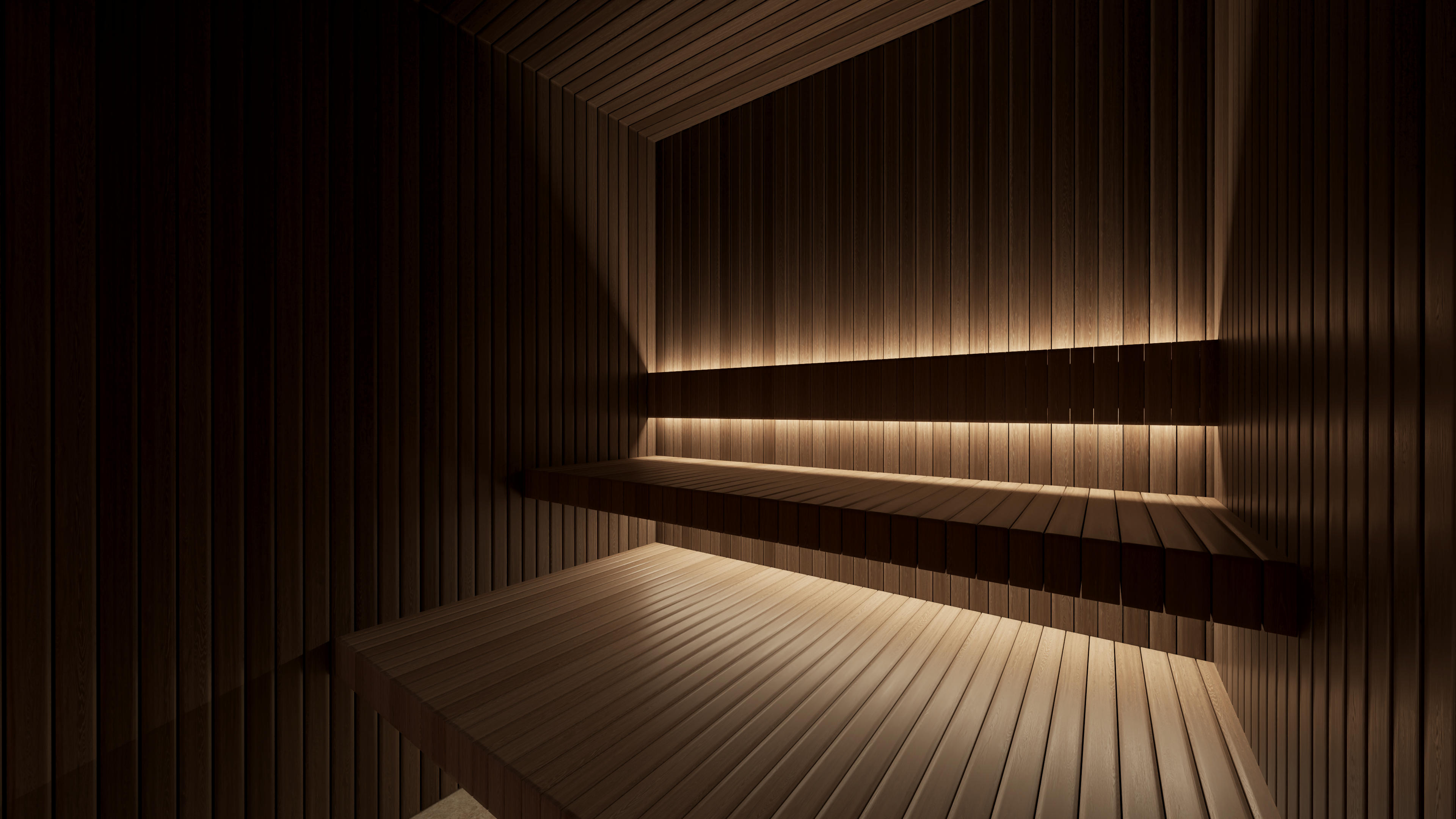 The sauna features vertical benching with precision mitred detailing, finished in Thermo Radiata with a contrasting Thermo Aspen wall in a KYTE-S profile. The vertical rhythm gives the room a strong architectural feel while keeping the space calm and understated.