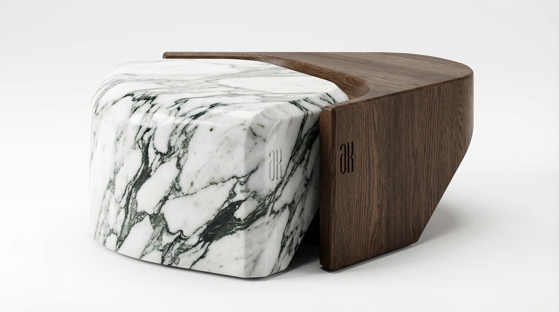 Half of the design is made from white marble with dark green veins, while the other half is crafted from dark oak wood. This contrast creates a strong industrial yet modern aesthetic, balancing natural warmth with refined luxury.