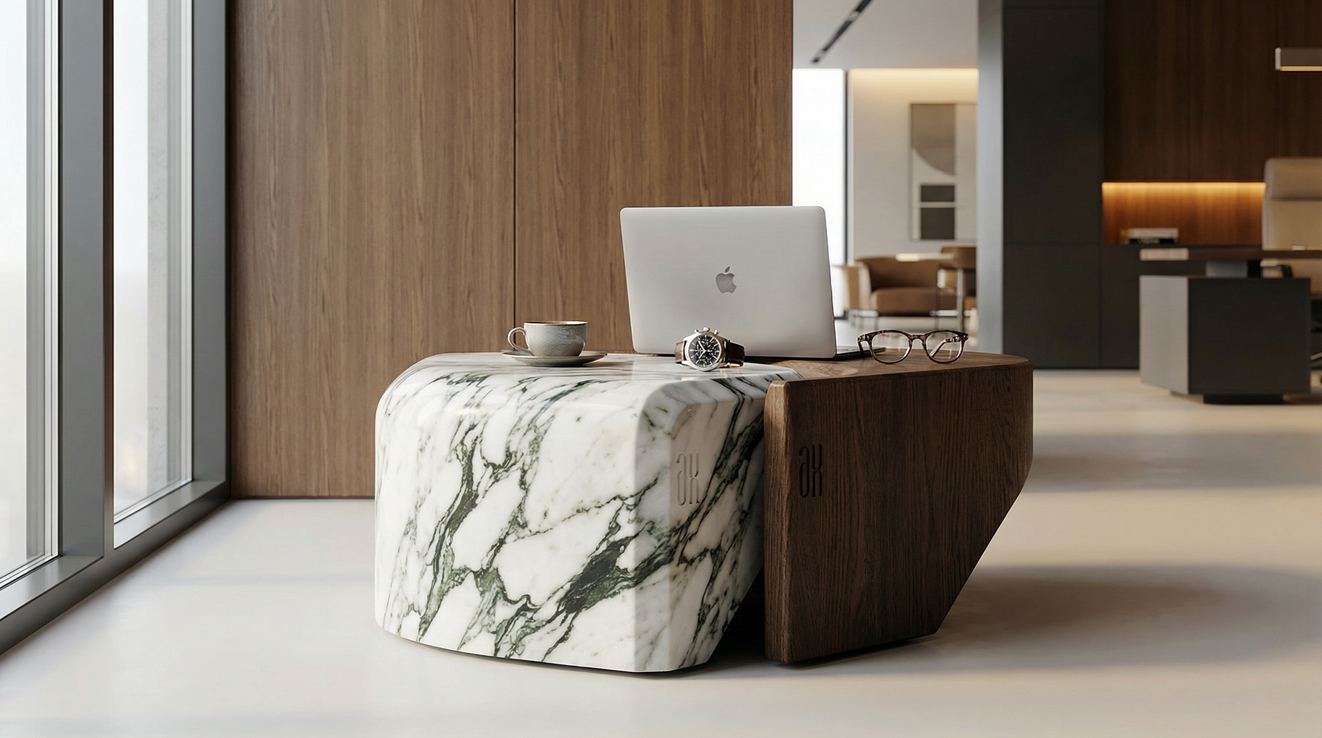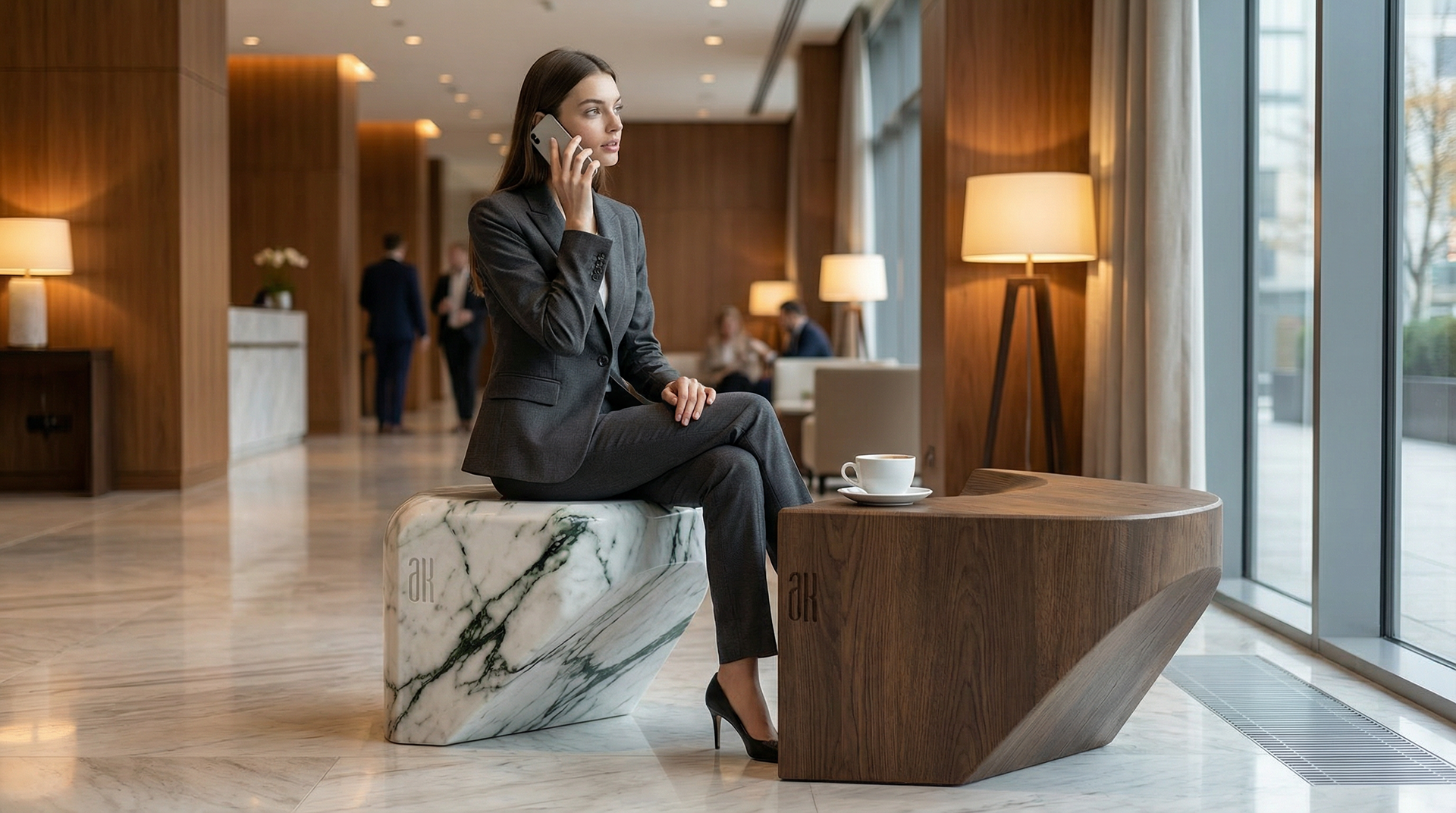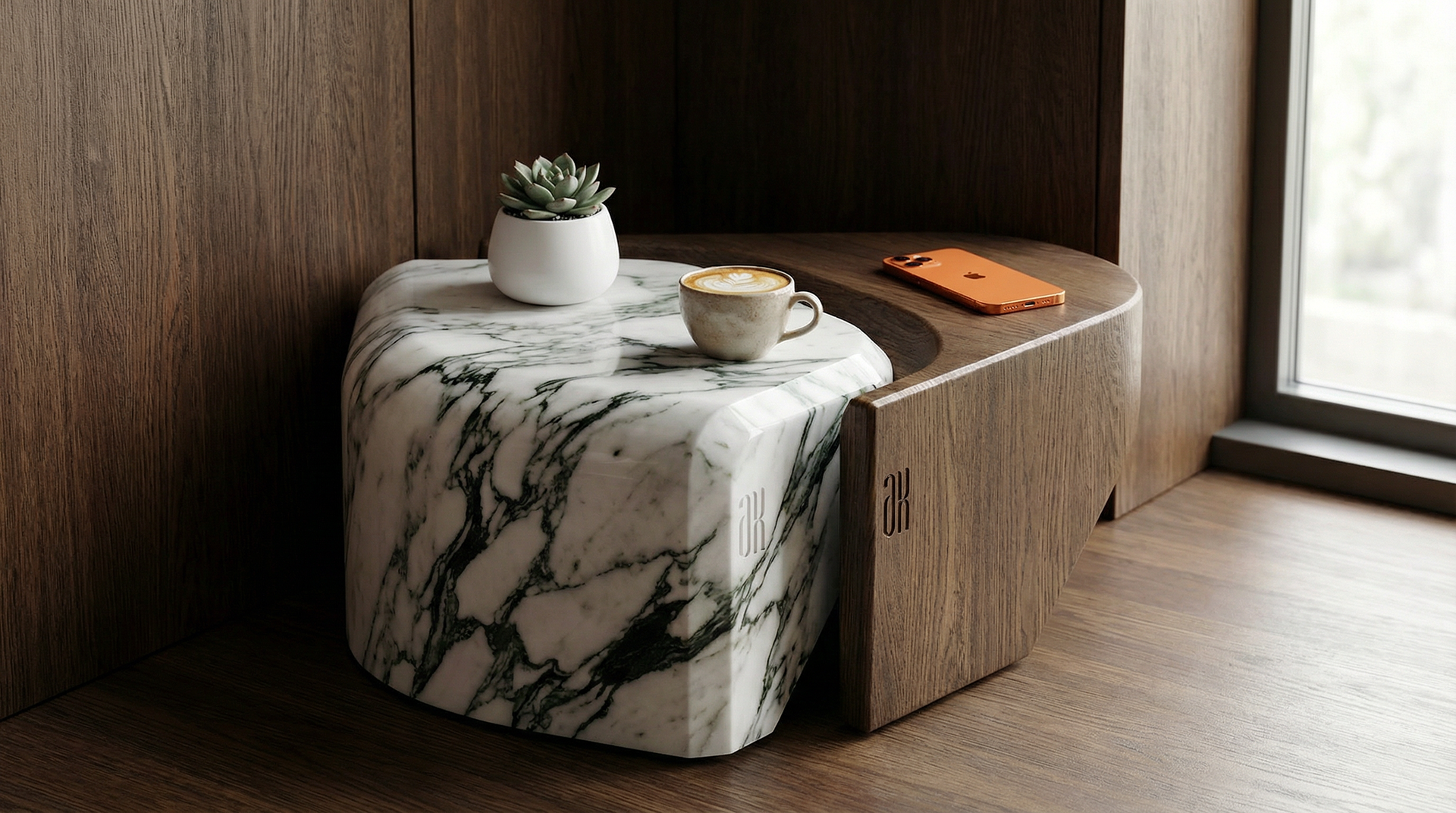 Material selection played a key role in this project. Both marble and wood were chosen for their eco-friendly properties, durability, and ability to perform in interior and exterior conditions. As a result, the design works seamlessly in residential spaces, commercial environments, business centers, lobbies, and outdoor areas always maintaining a luxury, contemporary presence.