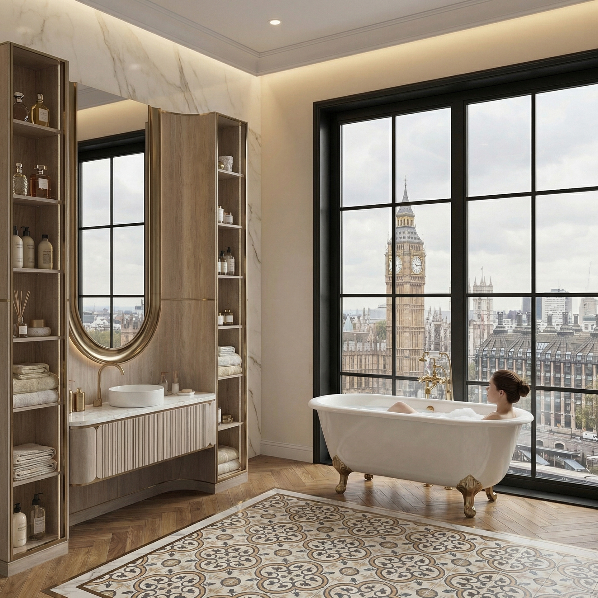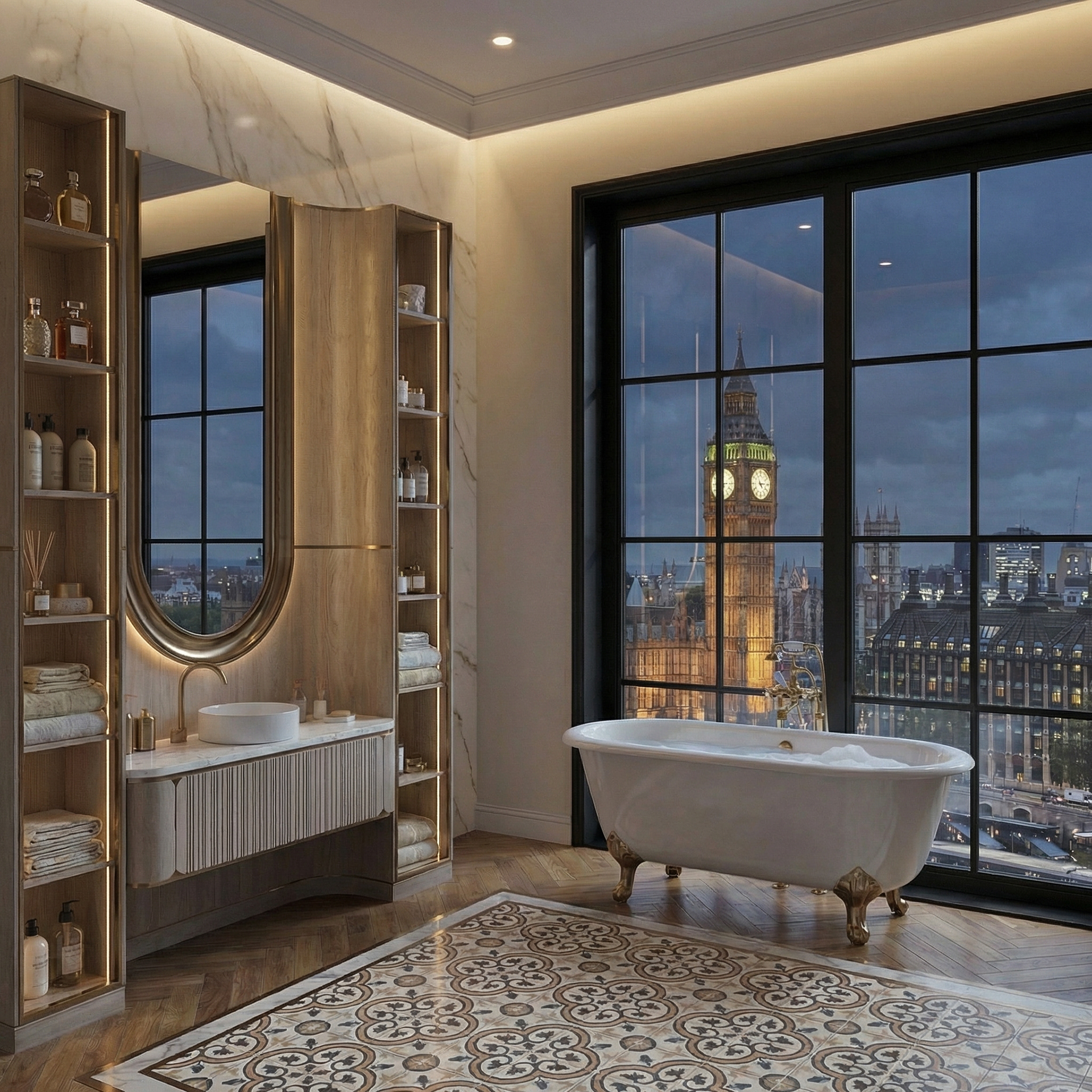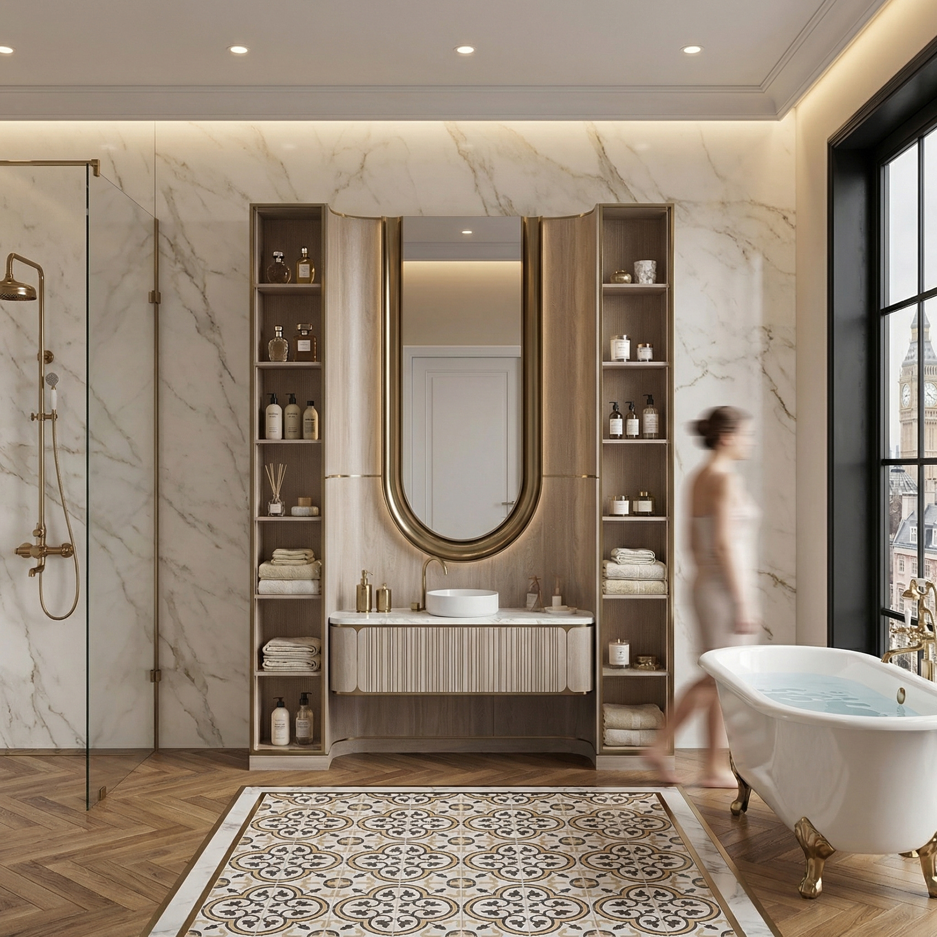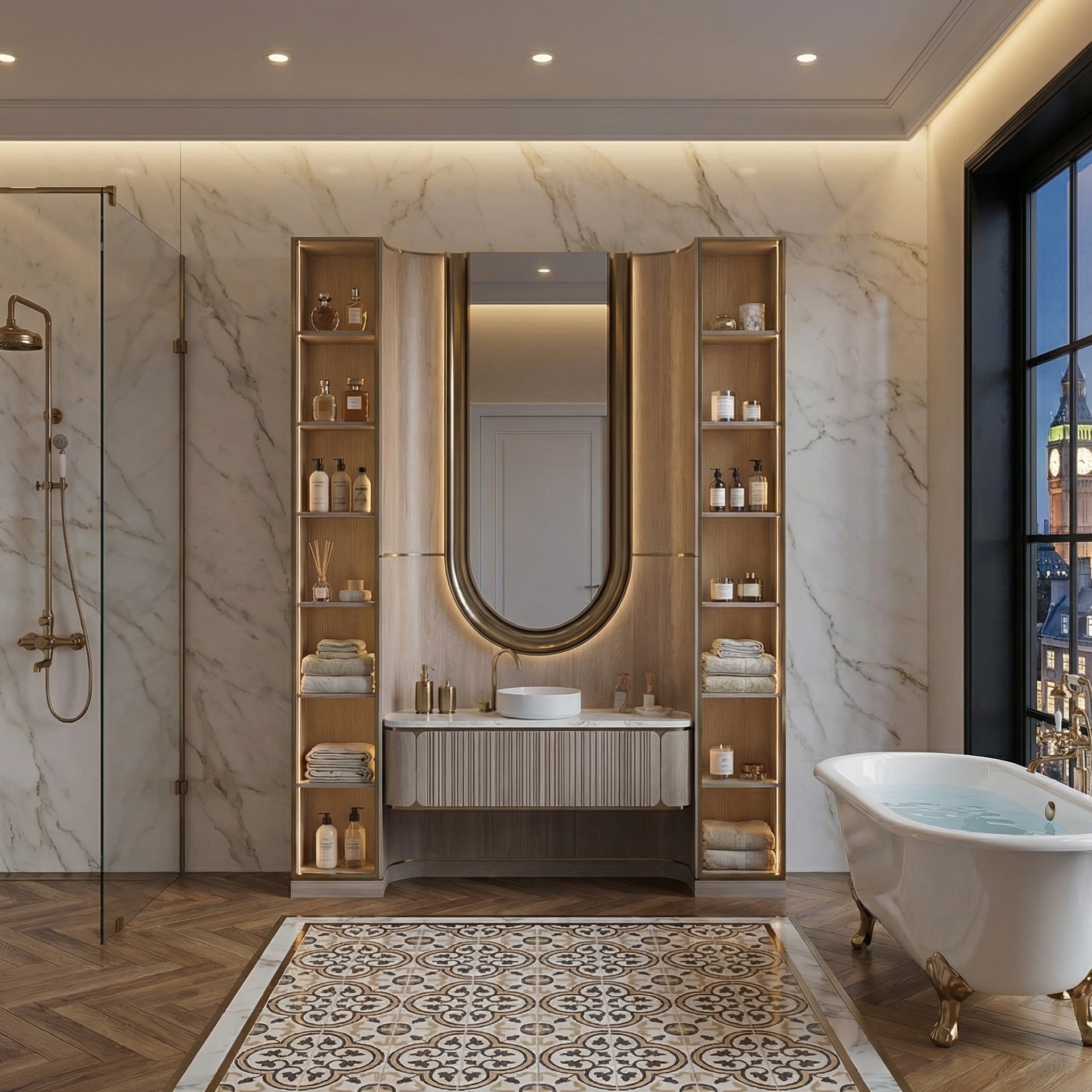 This project focuses on the design development of a luxury bathroom vanity and integrated shelving system, created as part of a high-end bathroom fit-out concept. The goal of the project was to design a refined vanity unit that combines modern aesthetics, functional storage, and premium material finishes, suitable for luxury residential environments in cities such as Dubai and London.