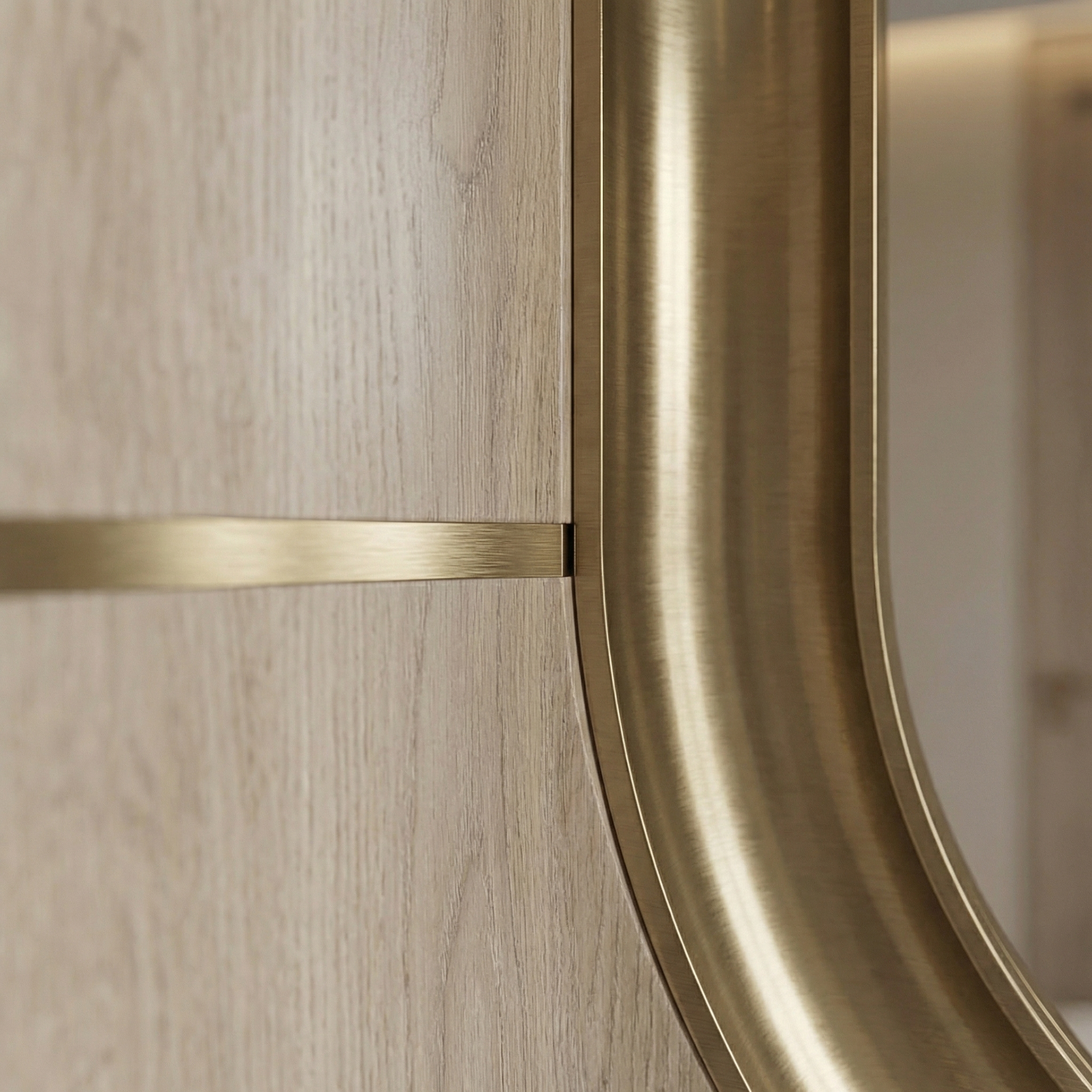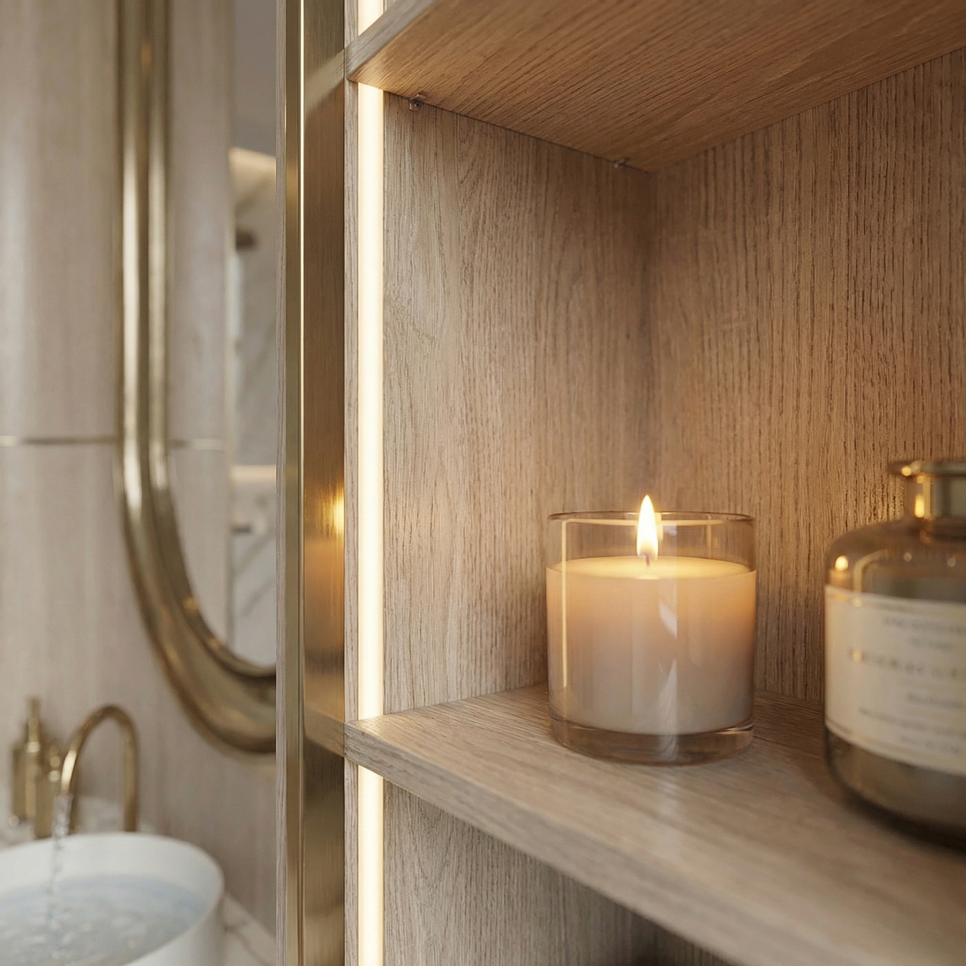 The mirror becomes a central design element, framed with a brushed brass structure and enhanced by integrated LED lighting, which creates a warm and sophisticated atmosphere. Additional concealed LED strips are integrated inside the shelving units, highlighting the materials and adding depth to the design.