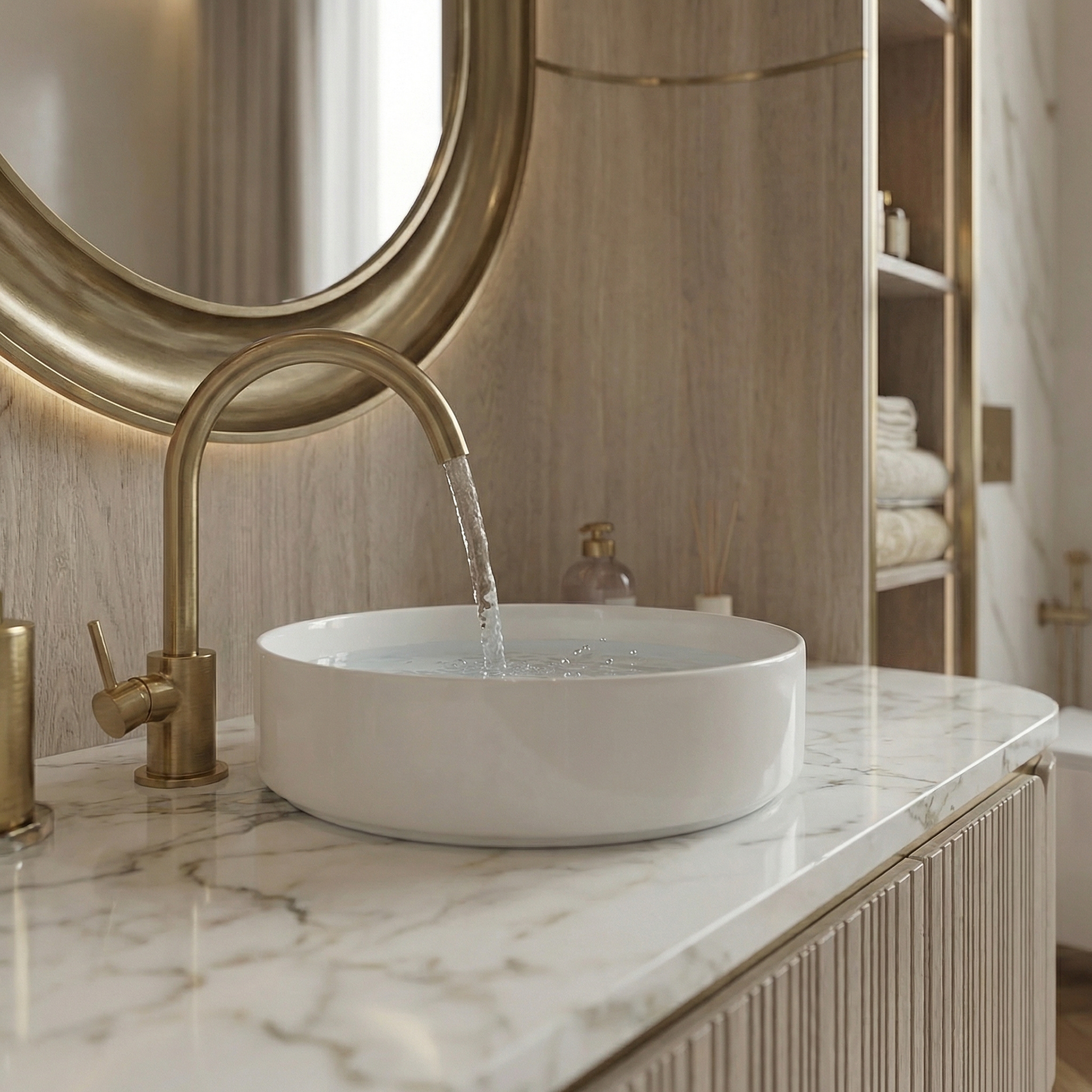 A round vessel basin sits on a marble countertop, paired with a brushed gold faucet to enhance the sense of luxury. The vanity unit itself is crafted with refined wood panel detailing and subtle curved forms that soften the overall geometry of the structure.