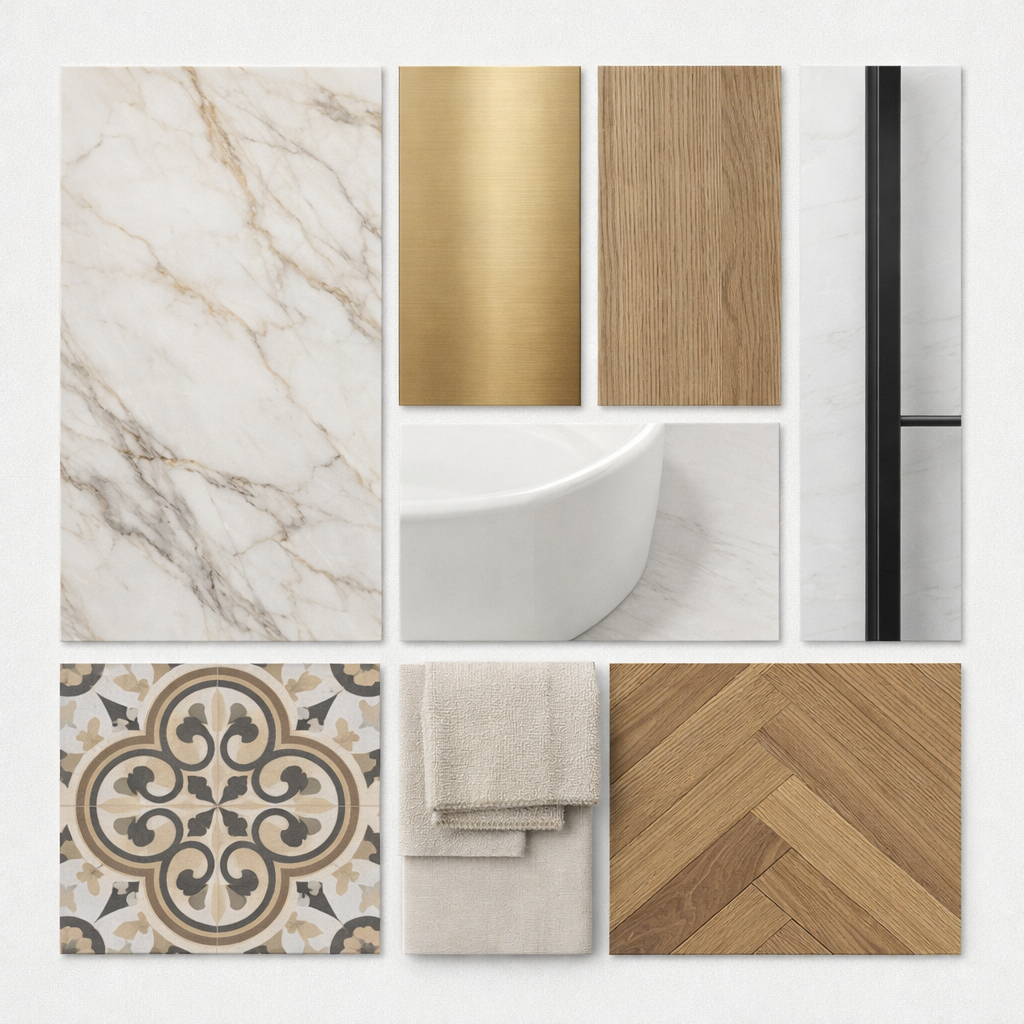 The material palette reflects a premium bathroom specification, commonly used in luxury developments: