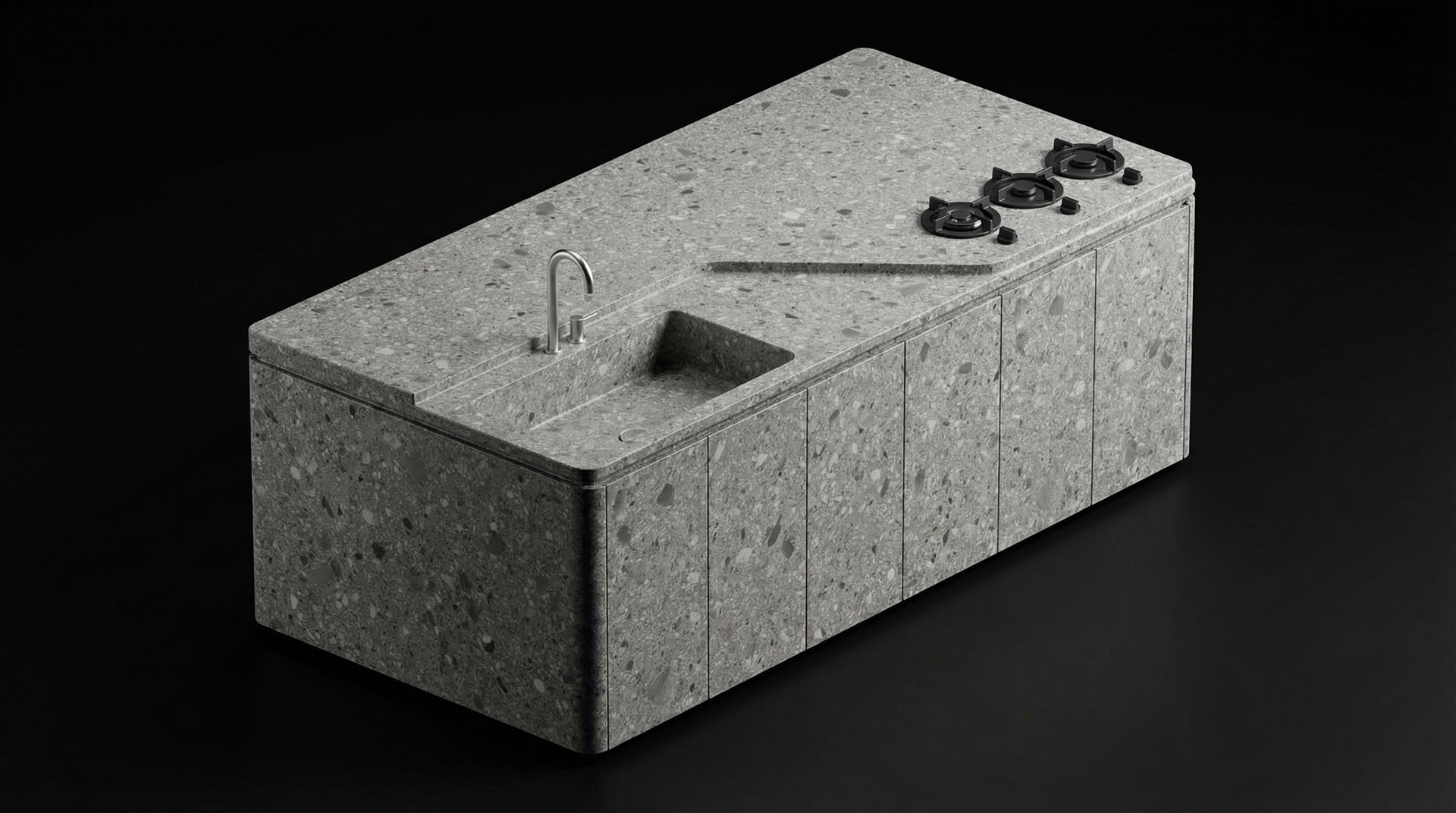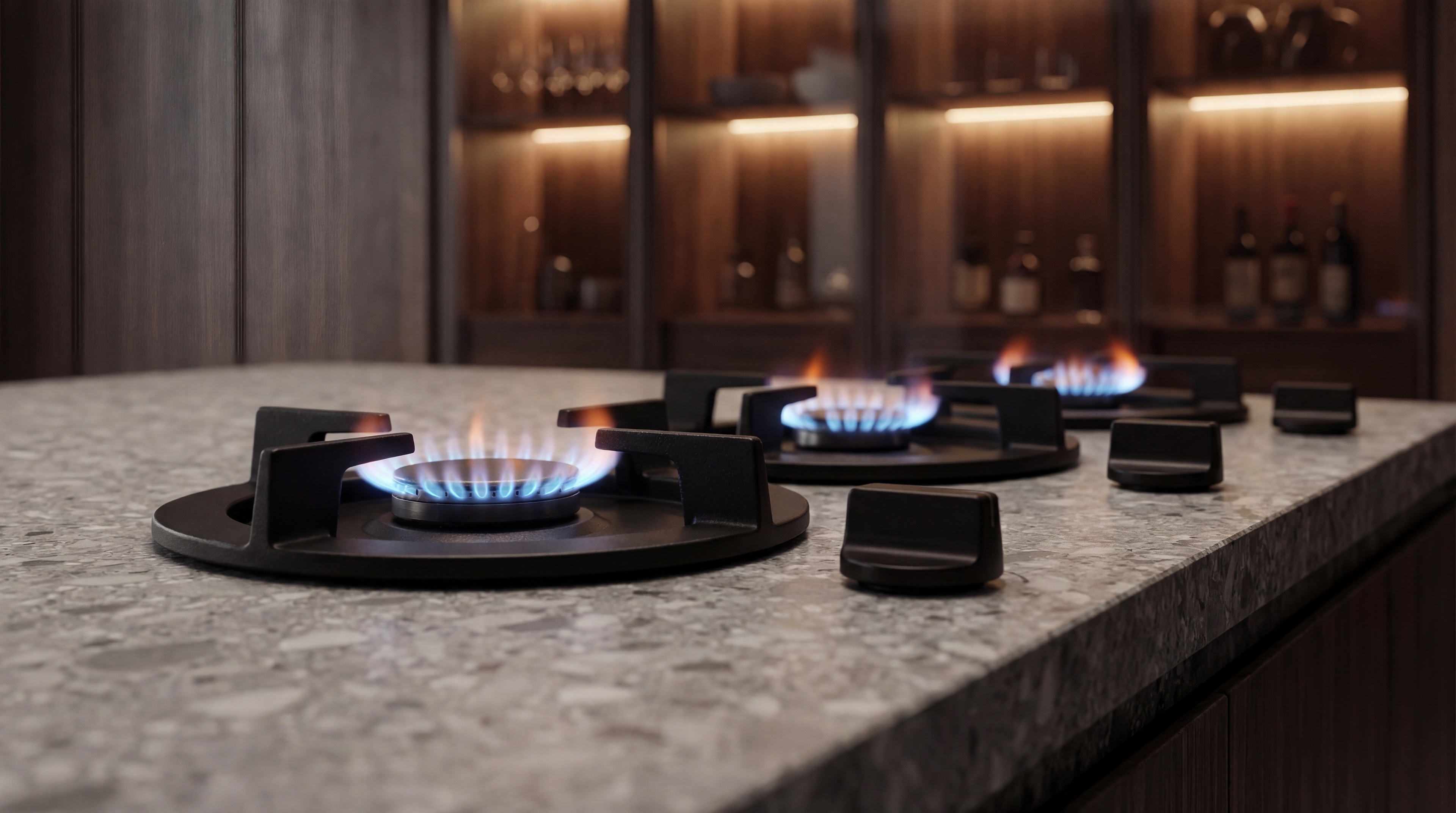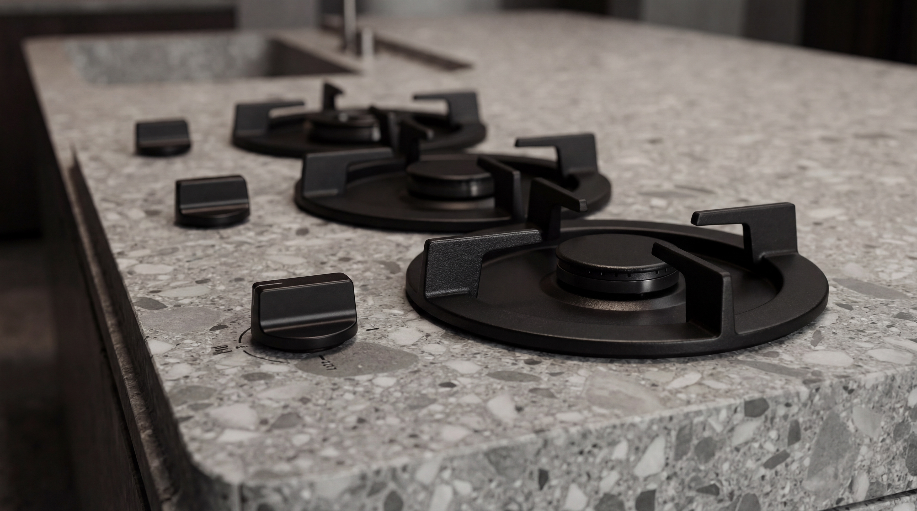 The cooking elements were also approached from a minimal perspective. Instead of traditional cooktop designs that visually dominate the counter surface, a set of minimal matte-black burners was selected. Their compact and refined form allows them to integrate naturally into the stone surface, making them feel like part of the countertop rather than a separate appliance.