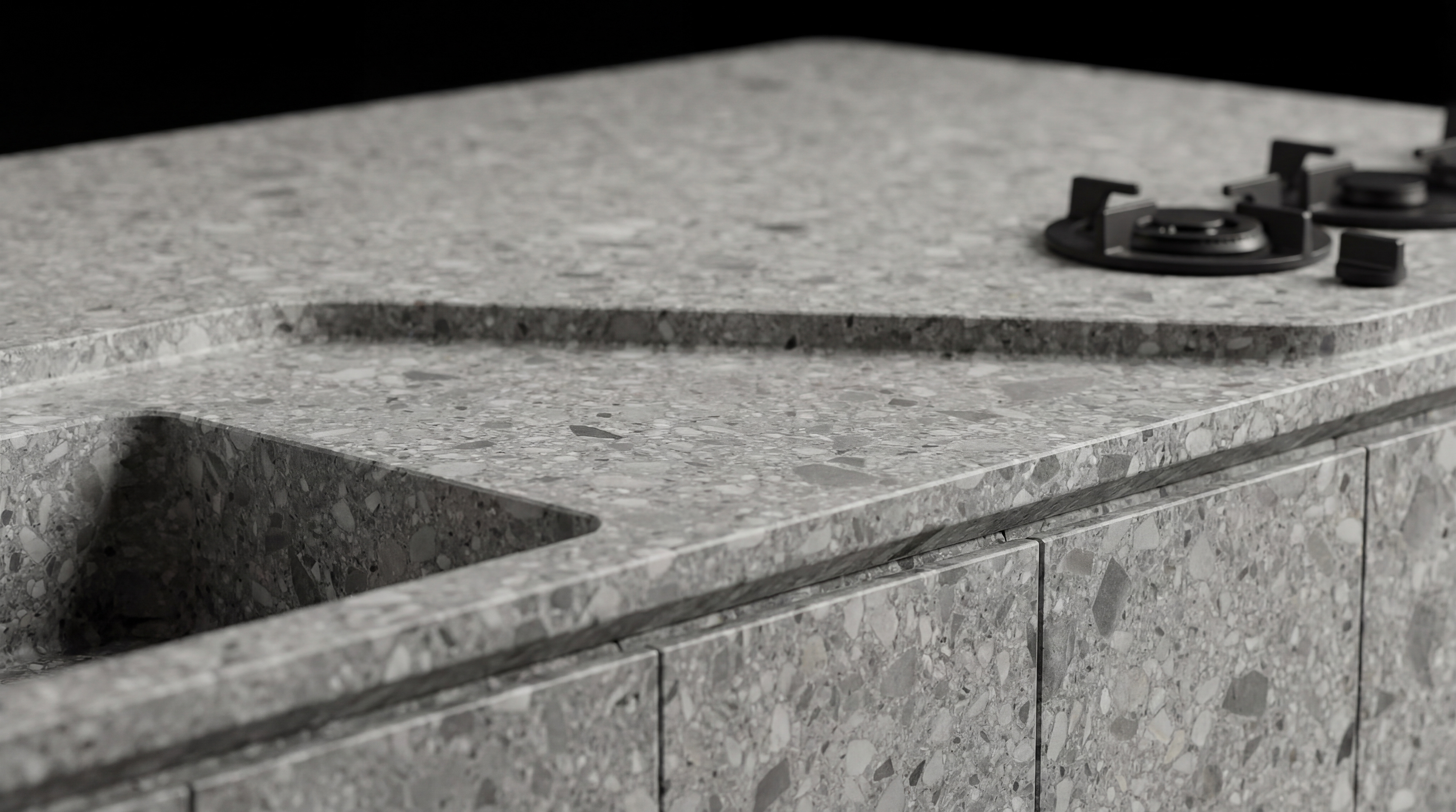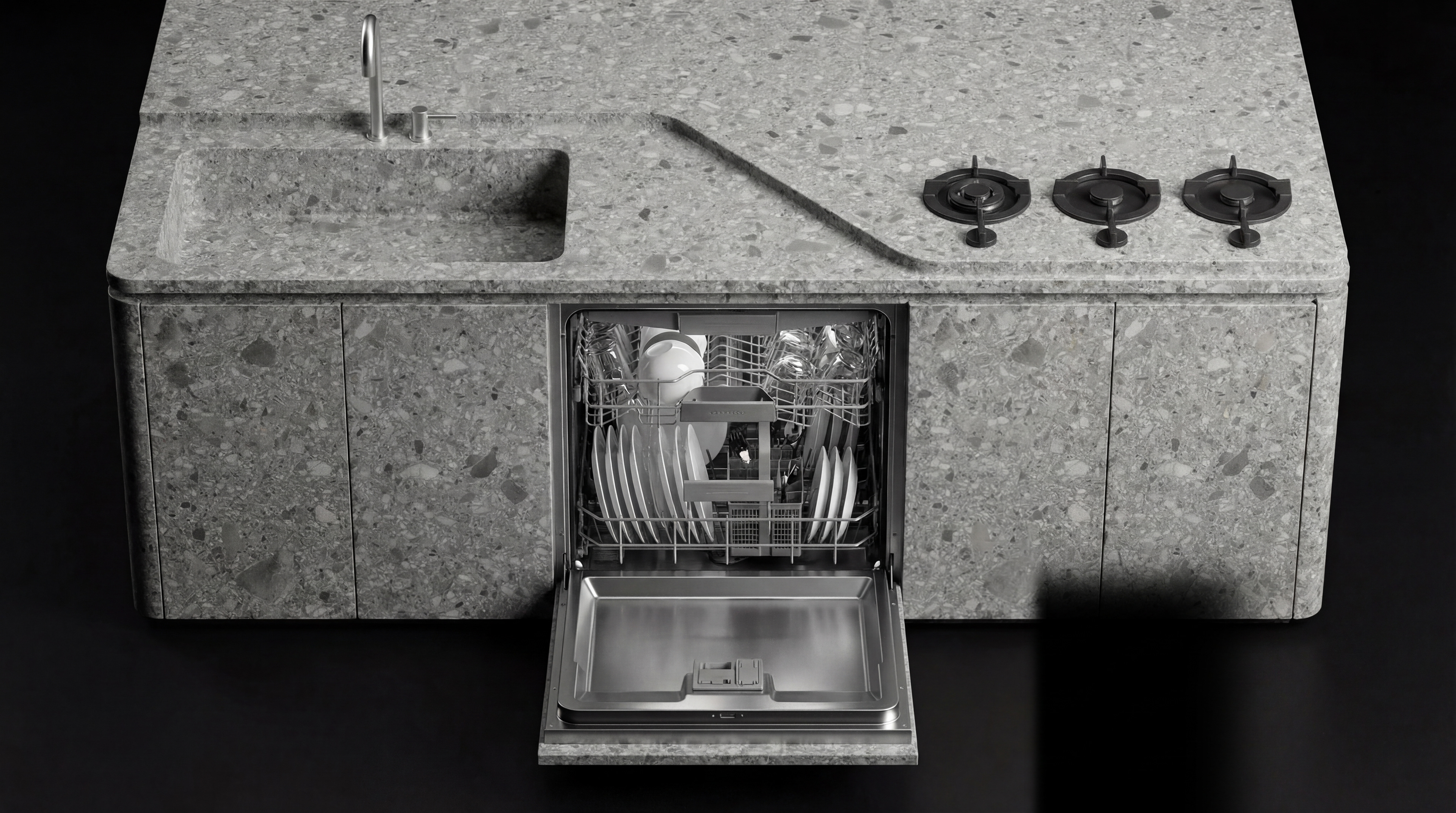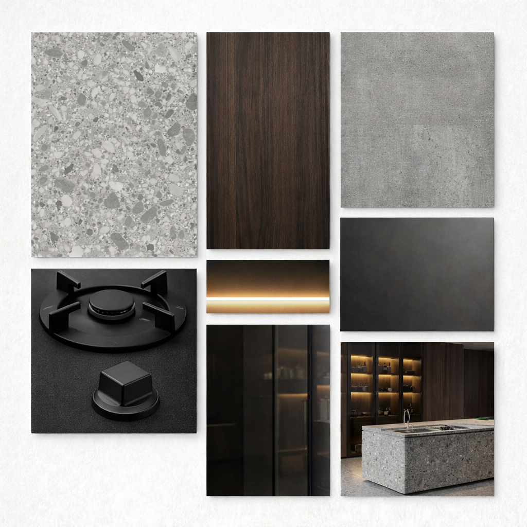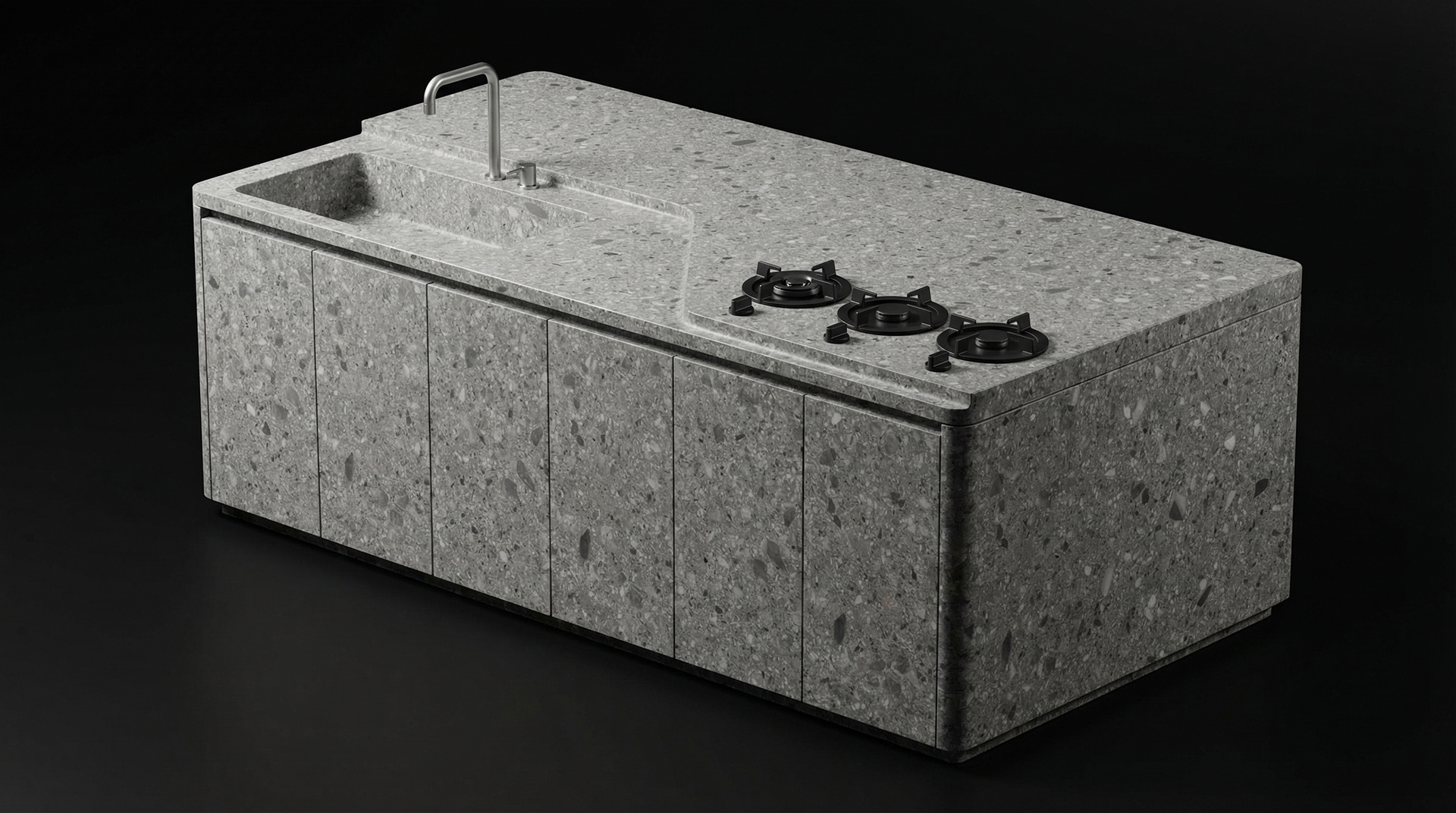 The cooking elements were also approached from a minimal perspective. Instead of traditional cooktop designs that visually dominate the counter surface, a set of minimal matte-black burners was selected. Their compact and refined form allows them to integrate naturally into the stone surface, making them feel like part of the countertop rather than a separate appliance.