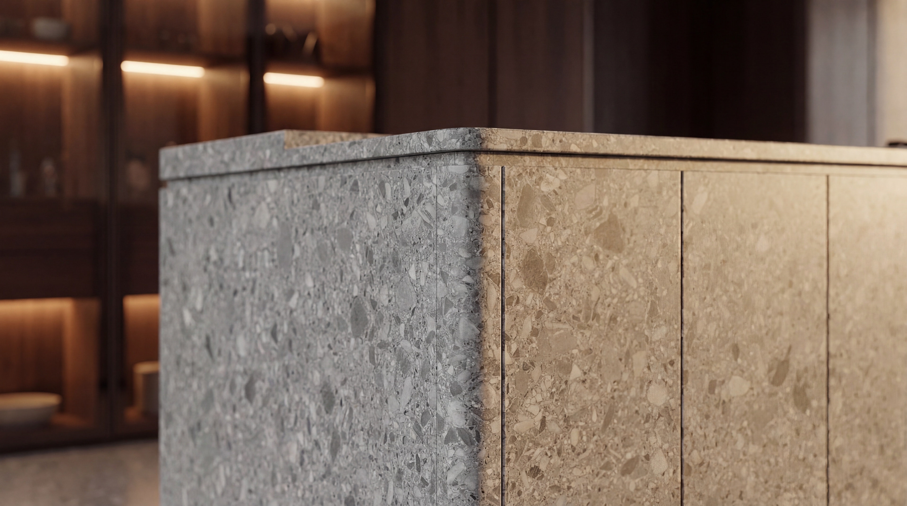 Material selection played a key role in achieving this effect. The entire counter was designed using gray Terrazzo, a natural stone that offers both minimalism and texture. Terrazzo was chosen specifically for its ability to complement contemporary interiors while maintaining a timeless architectural character. To further integrate the counter into the environment, the same Terrazzo material used on the kitchen floor was extended to the counter, creating a seamless visual continuity between the surfaces.