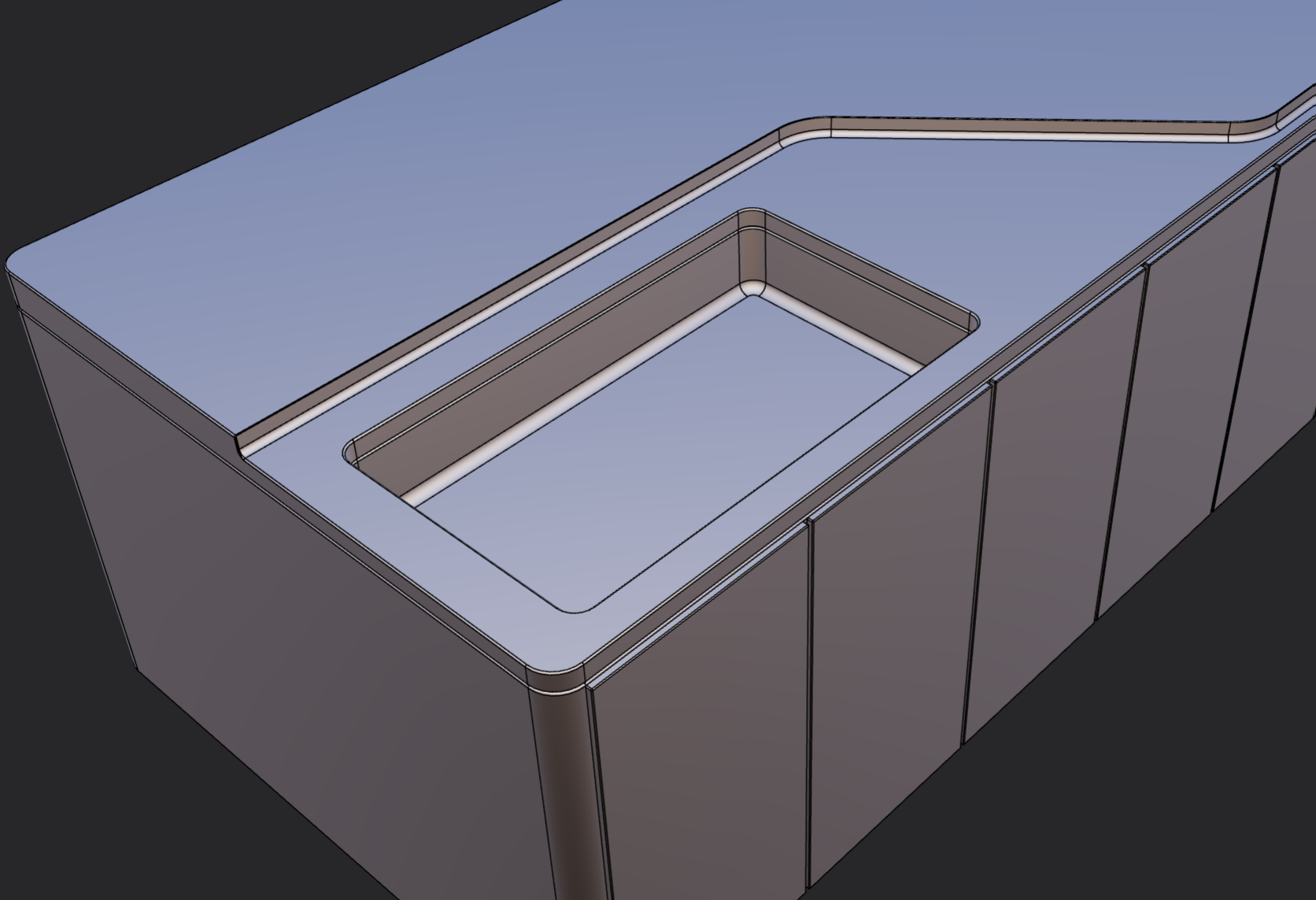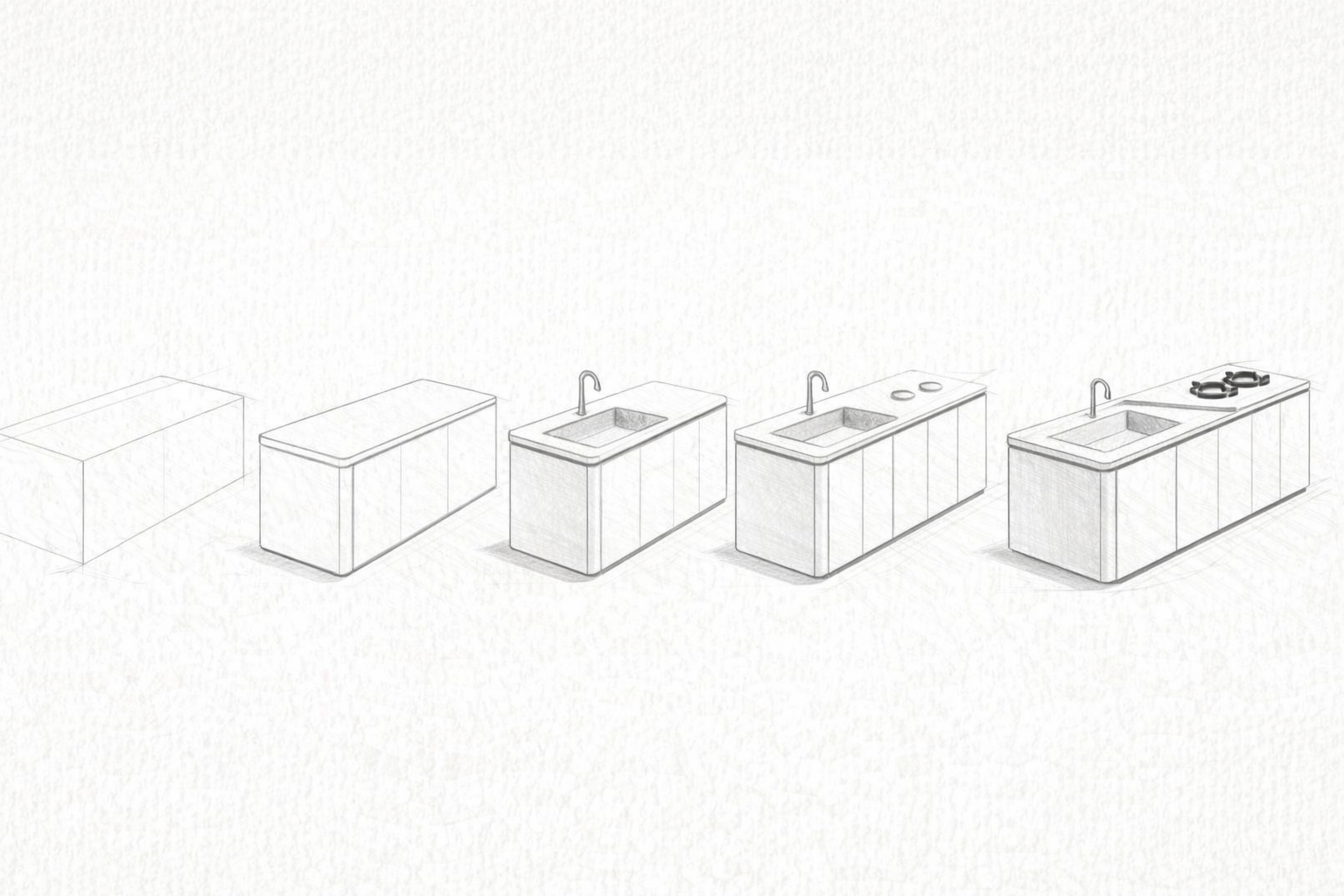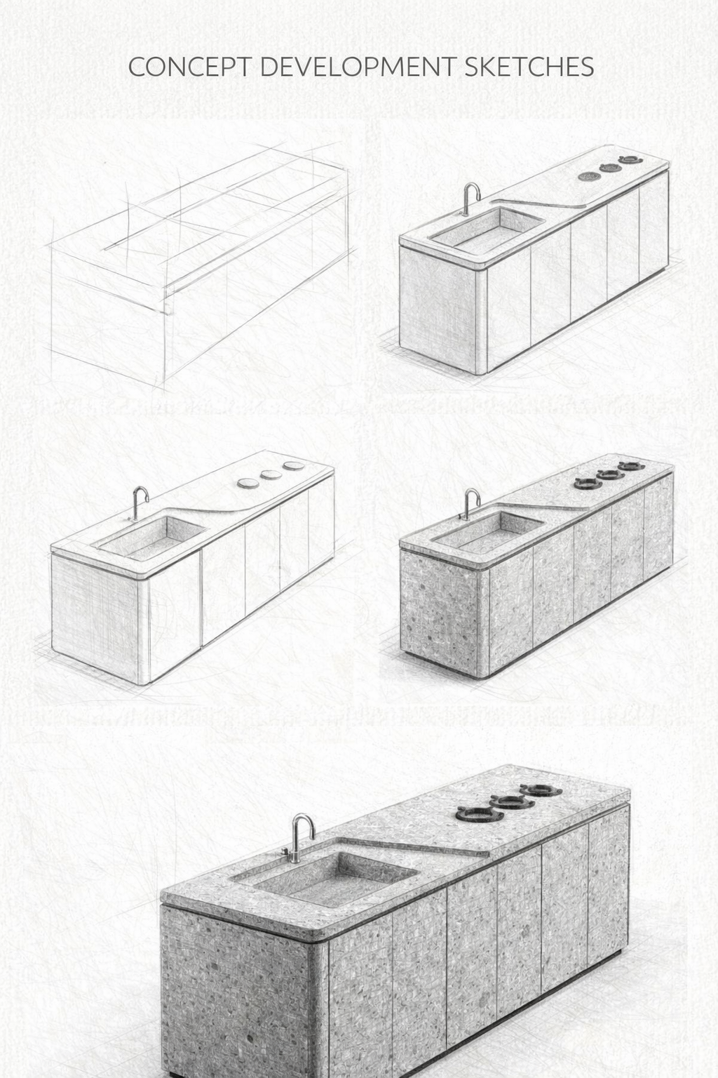 The project began with a series of concept sketches exploring the fundamental geometry of the kitchen island. The design evolved from simple rectangular forms into a more refined shape with softened edges and a subtle separation between the cooking and washing areas.