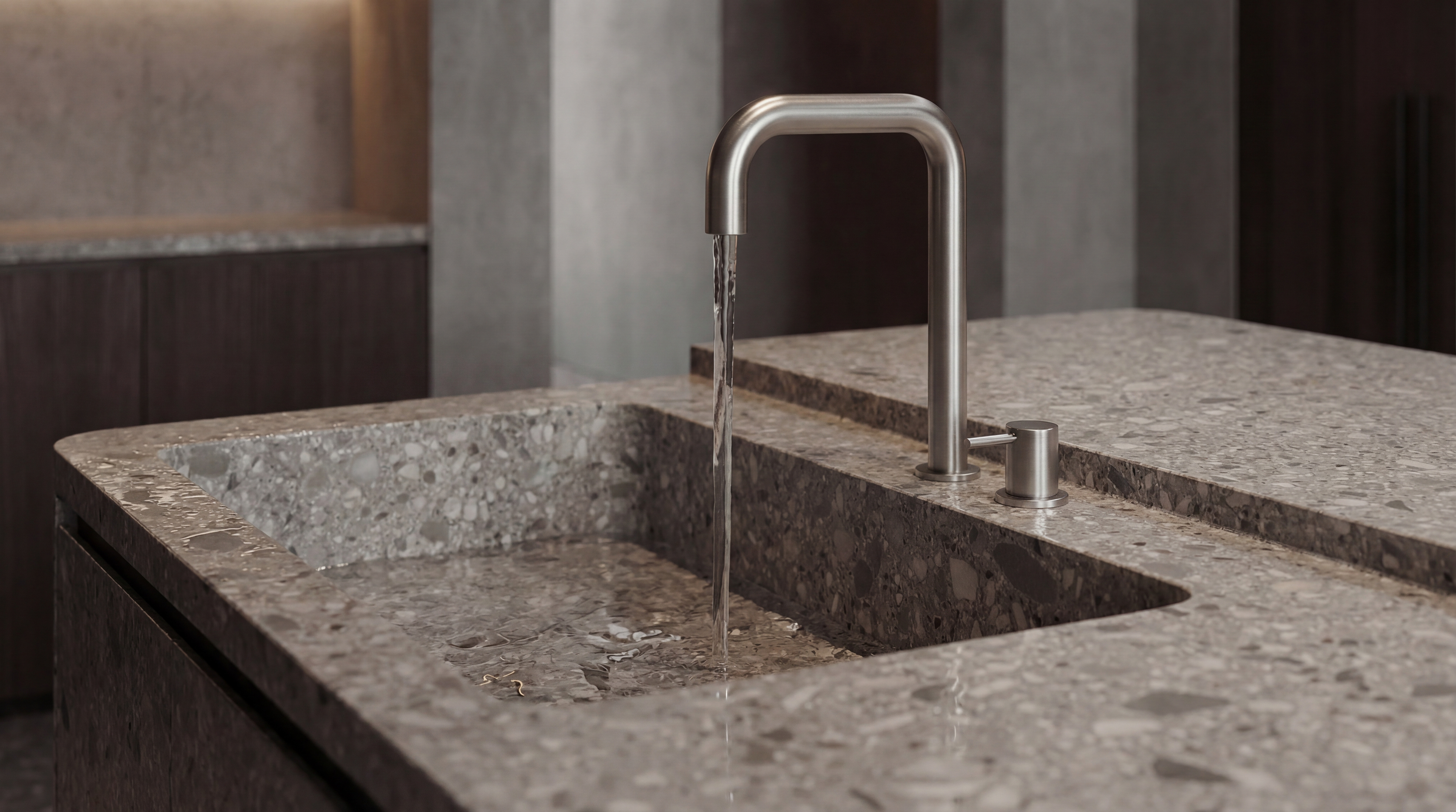 Similarly, the faucet design follows the same philosophy. A minimal curved tap was chosen to echo the soft transitions and curves present in the countertop geometry. This continuity between elements helps unify the design language across the entire composition.