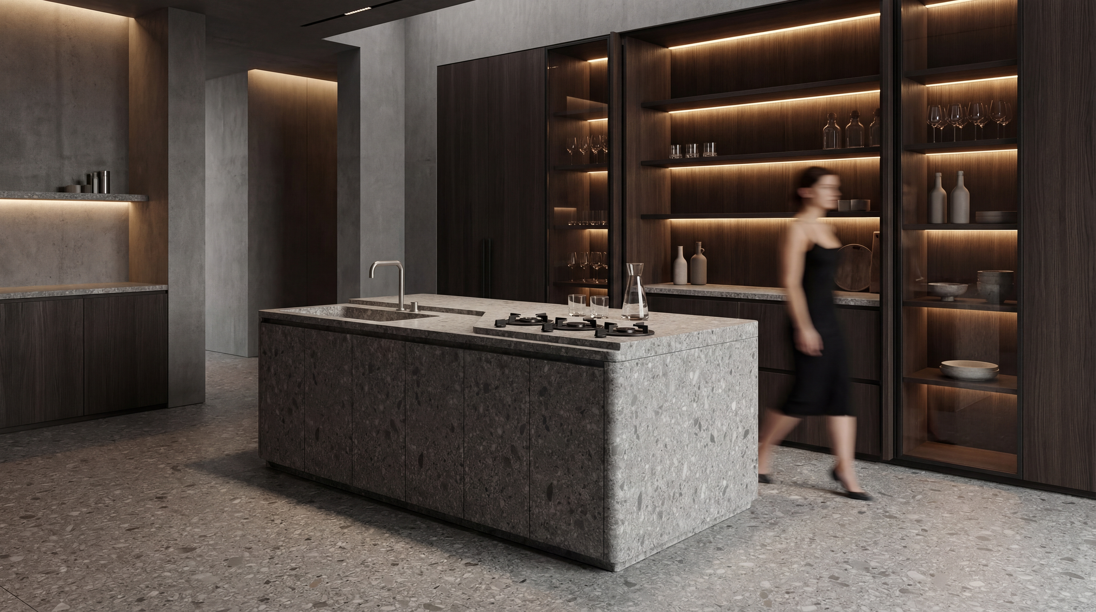 To balance the cool tone of the stone, darker wood tones were introduced throughout the kitchen cabinetry and shelving system. These warm wood finishes create contrast against the stone surfaces while adding depth and richness to the overall composition.