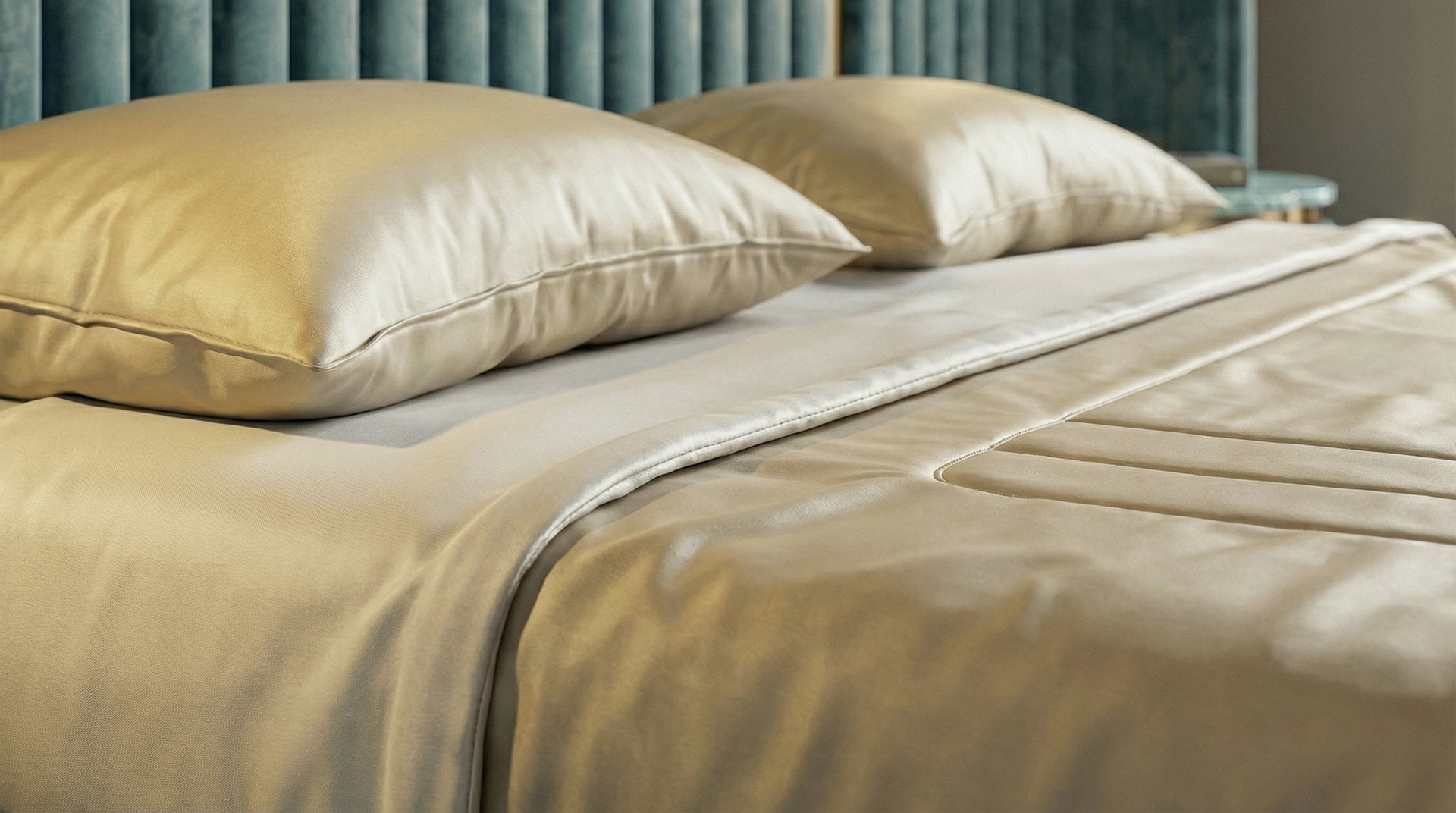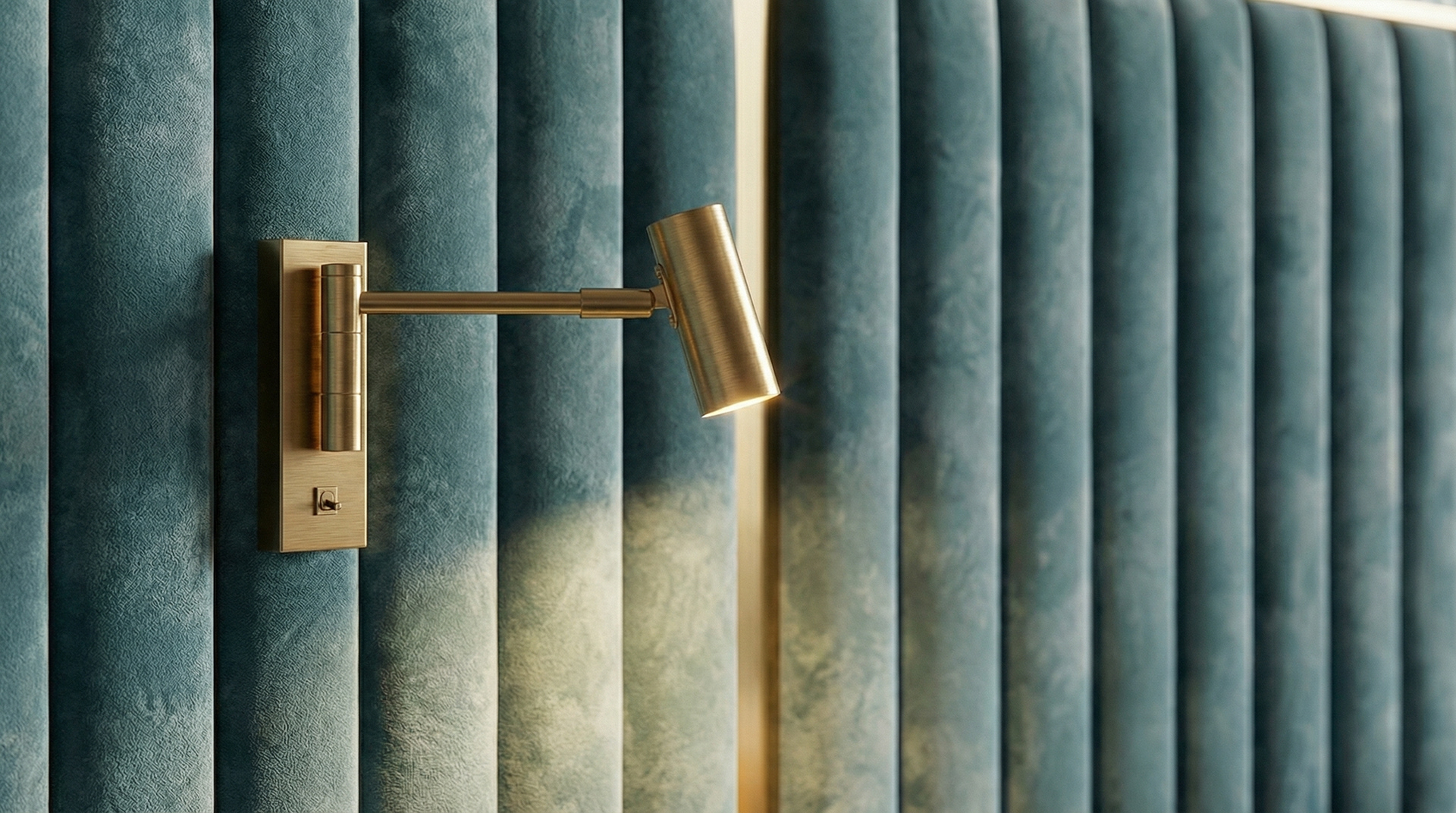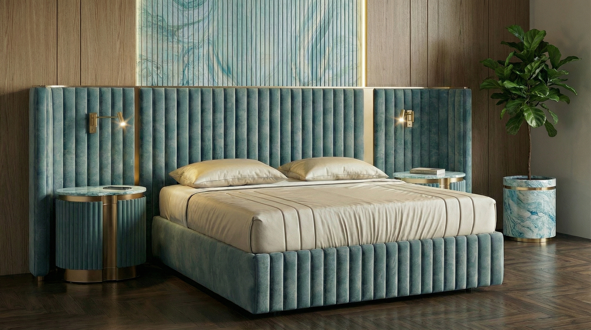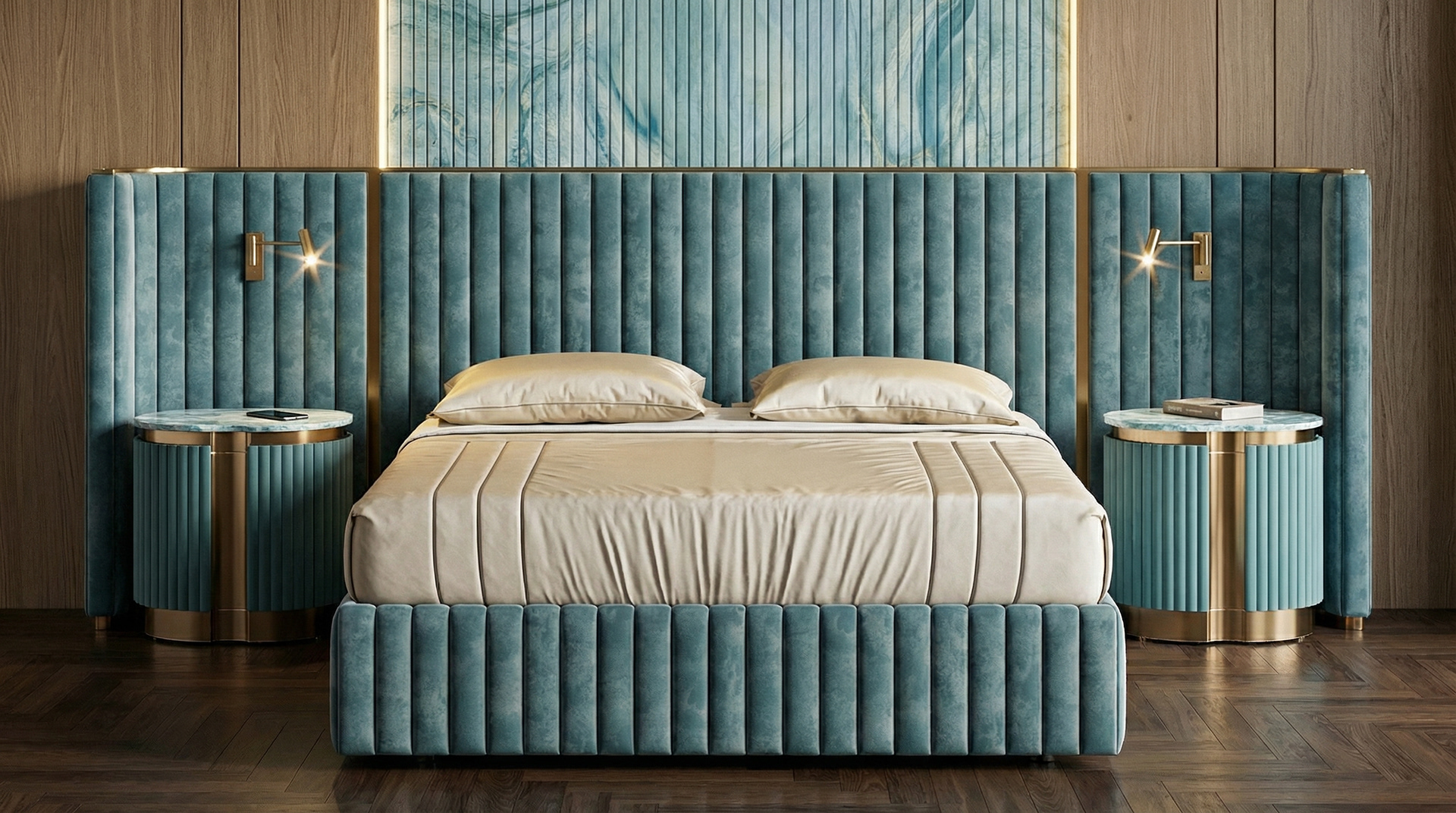 The design is built around contrast. Light wood wall panels create a warm and calm backdrop, while the darker parquet flooring grounds the space and adds depth. At the center of the composition, the bed becomes the focal point , wrapped in a soft blue tone that immediately draws attention while maintaining a sense of elegance. This contrast between light and dark, warm and cool, creates a visual balance that defines the entire room.