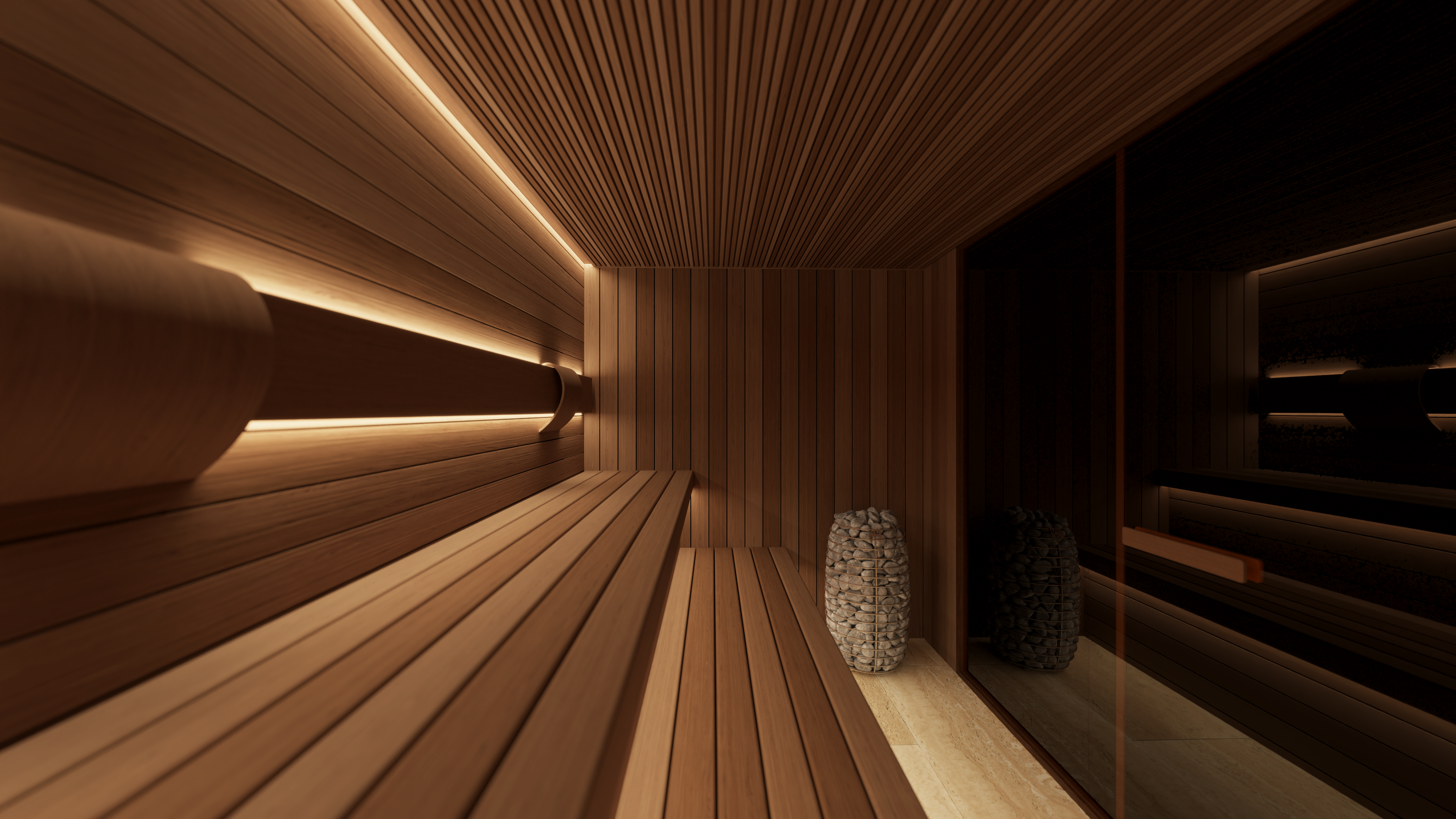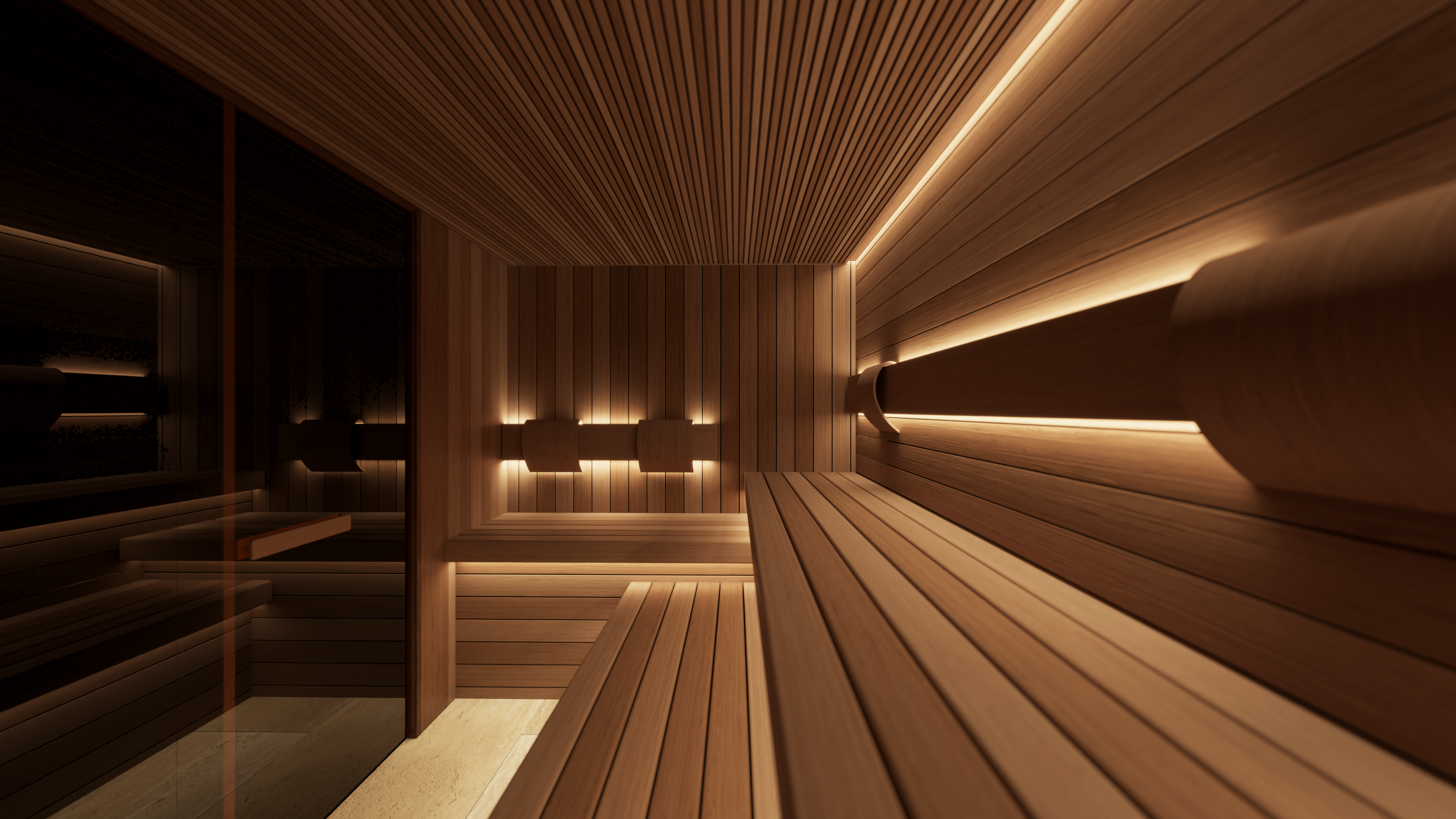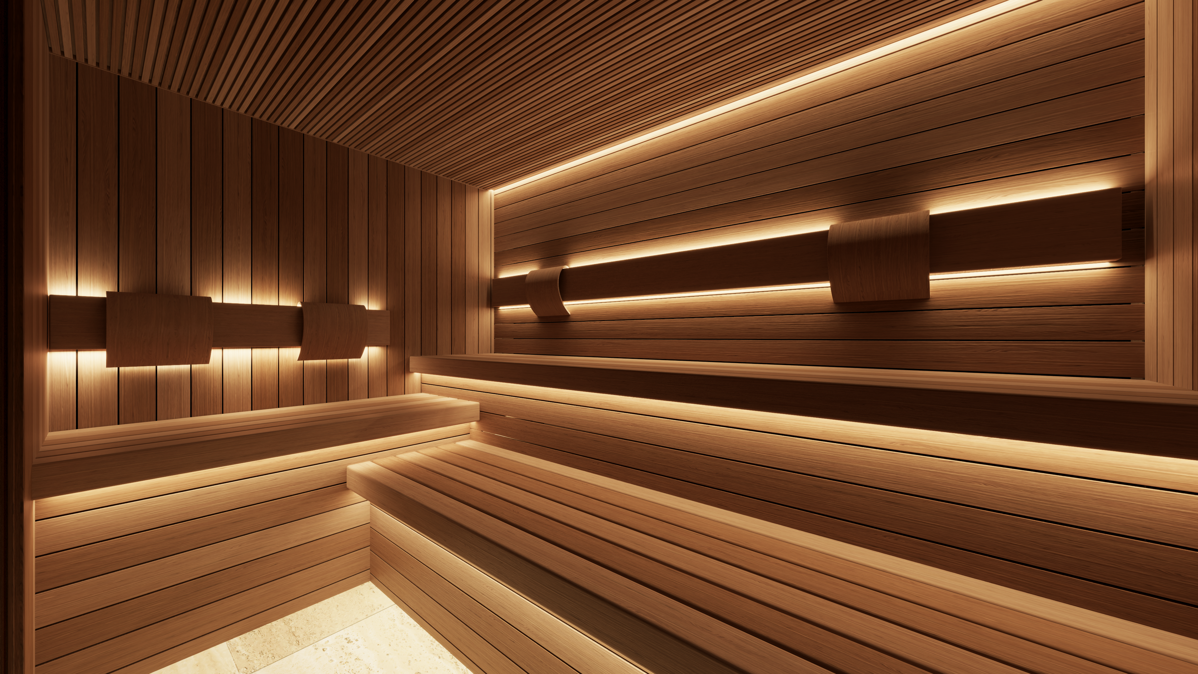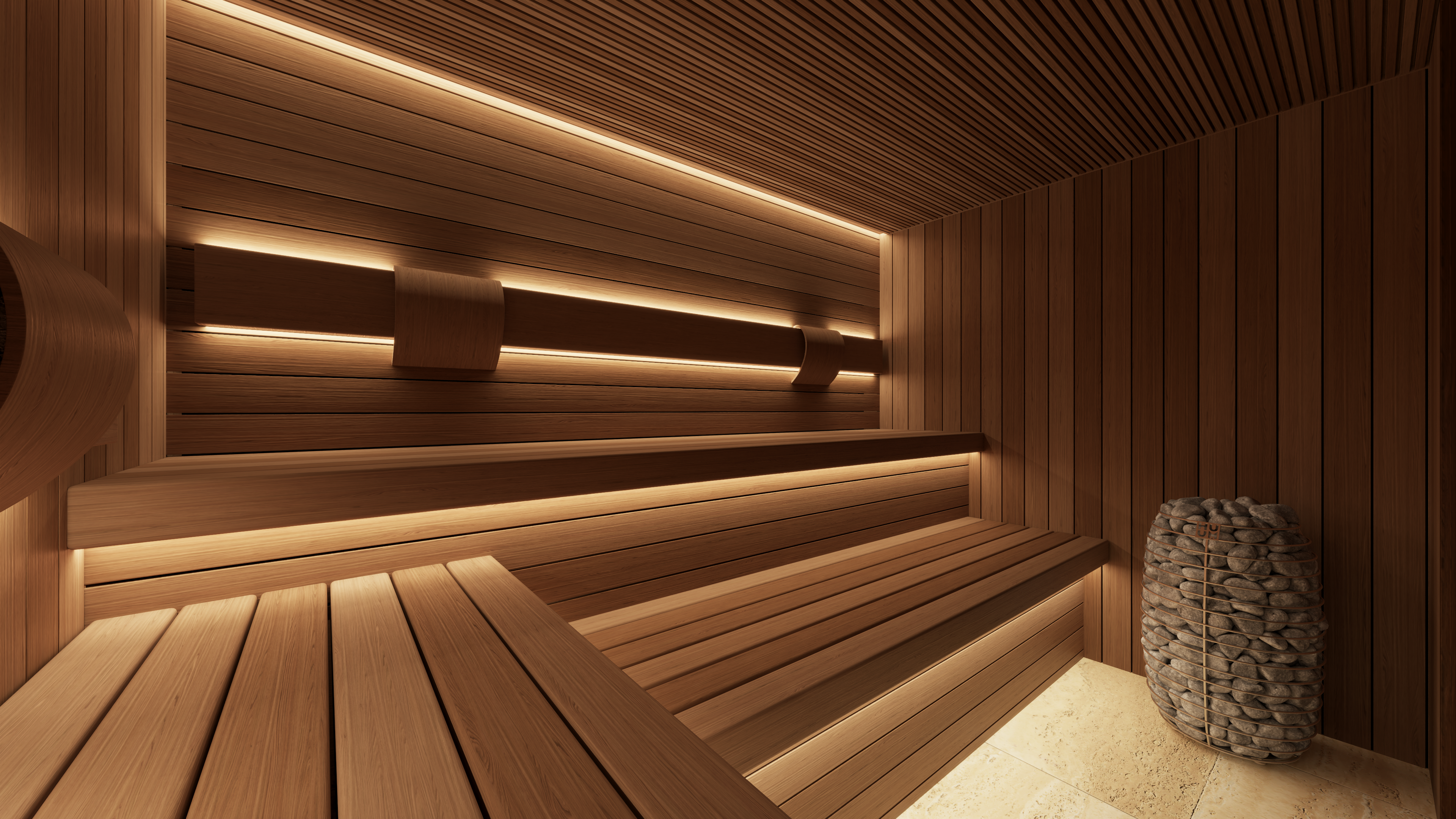 The sauna also incorporates a discreet, state-of-the-art mechanical ventilation system concealed within the walls and benching. Underfoot, a natural stone tiled floor with an integrated drain completes the space, staying true to traditional sauna design principles while maintaining a refined, luxury finish.