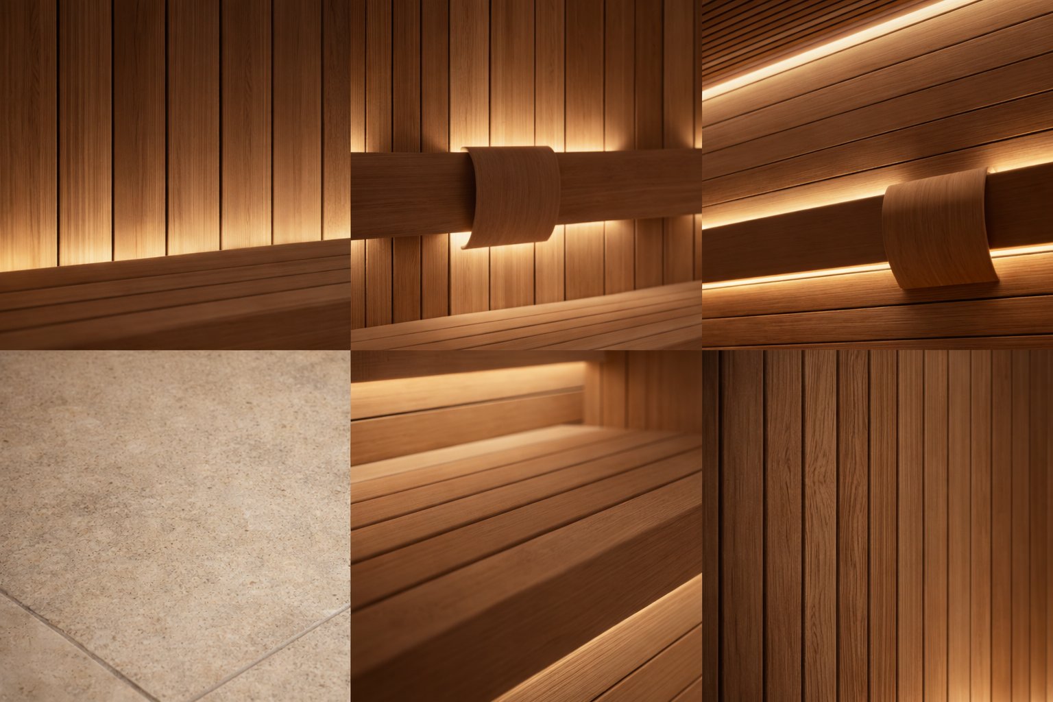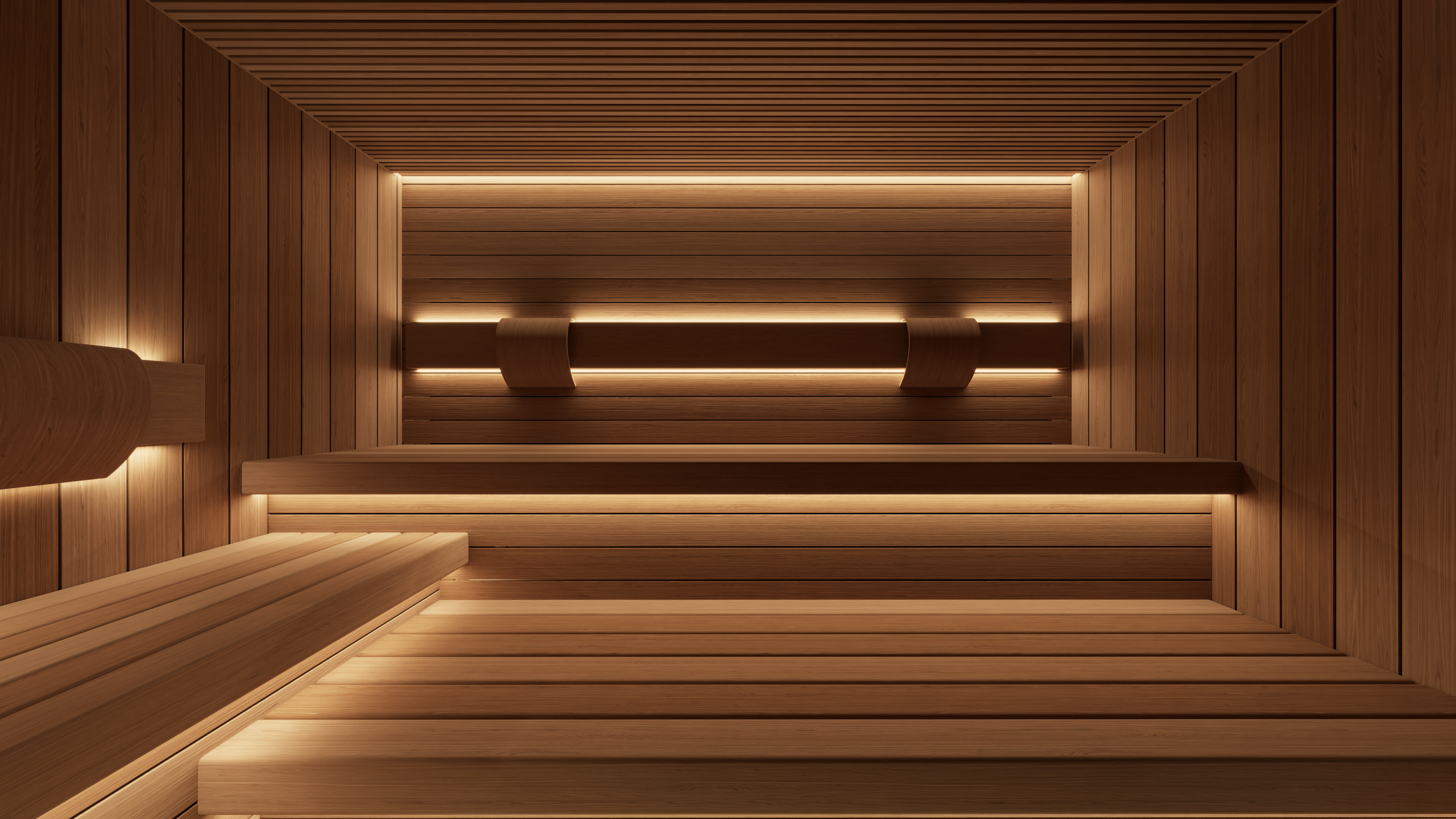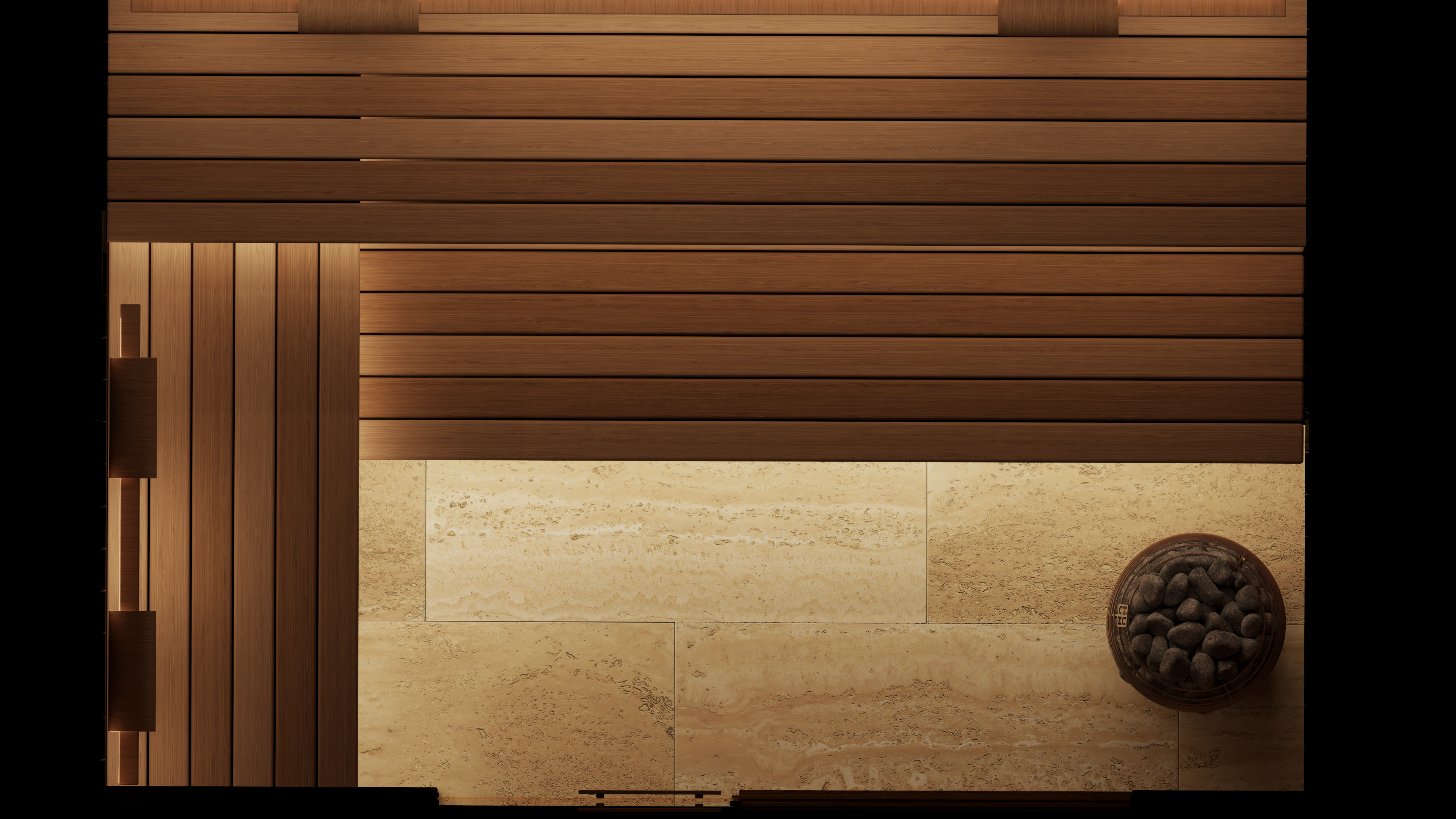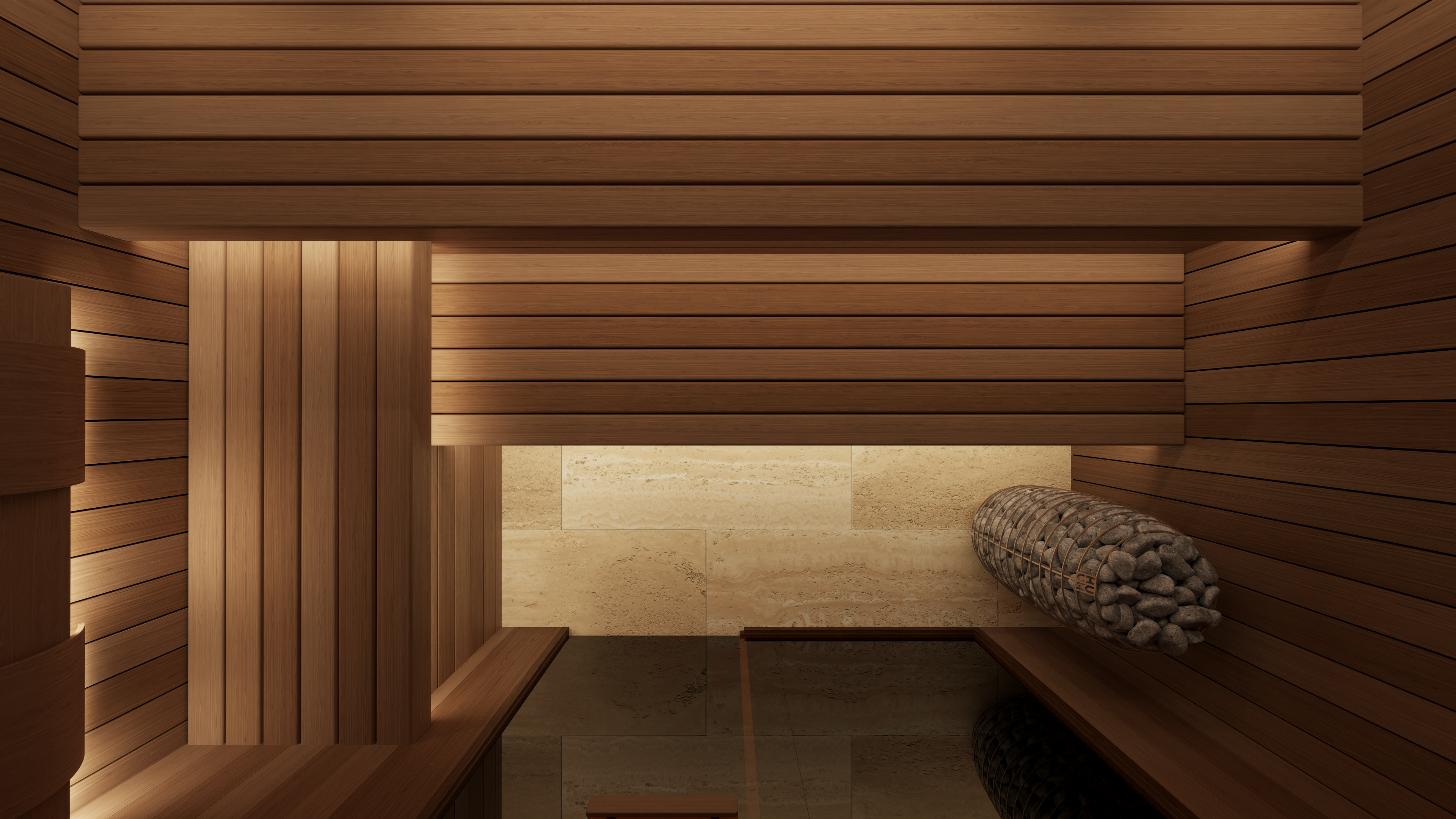The sauna also incorporates a discreet, state-of-the-art mechanical ventilation system concealed within the walls and benching. Underfoot, a natural stone tiled floor with an integrated drain completes the space, staying true to traditional sauna design principles while maintaining a refined, luxury finish.