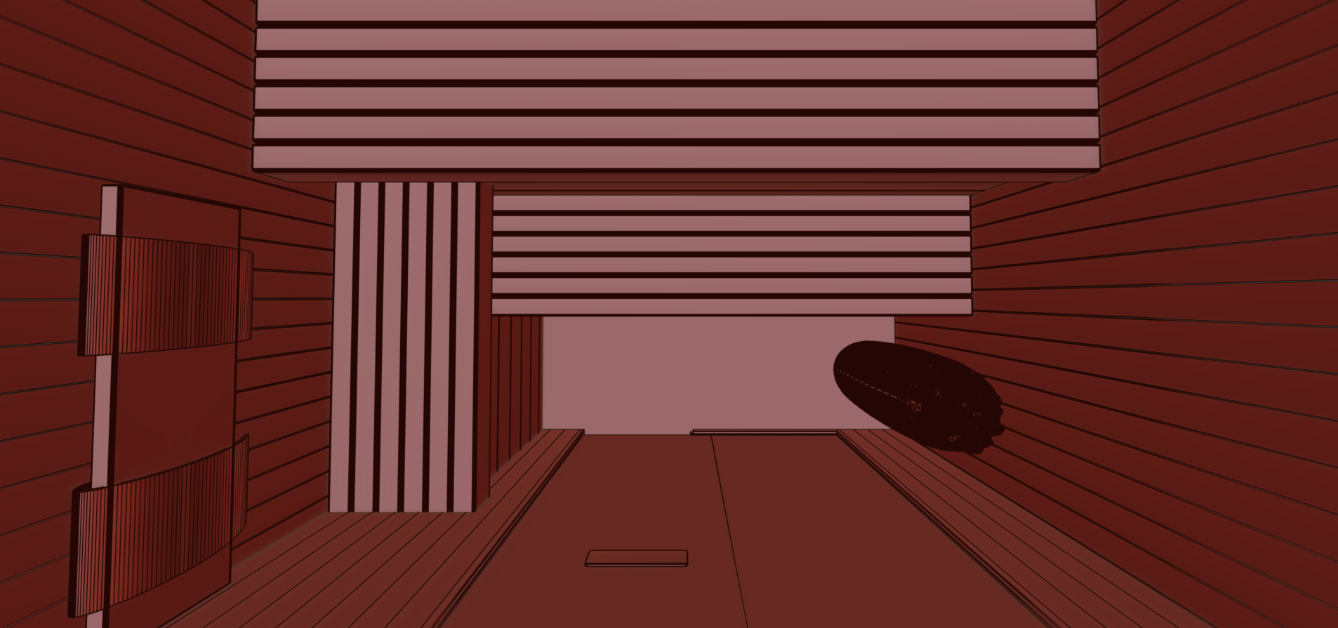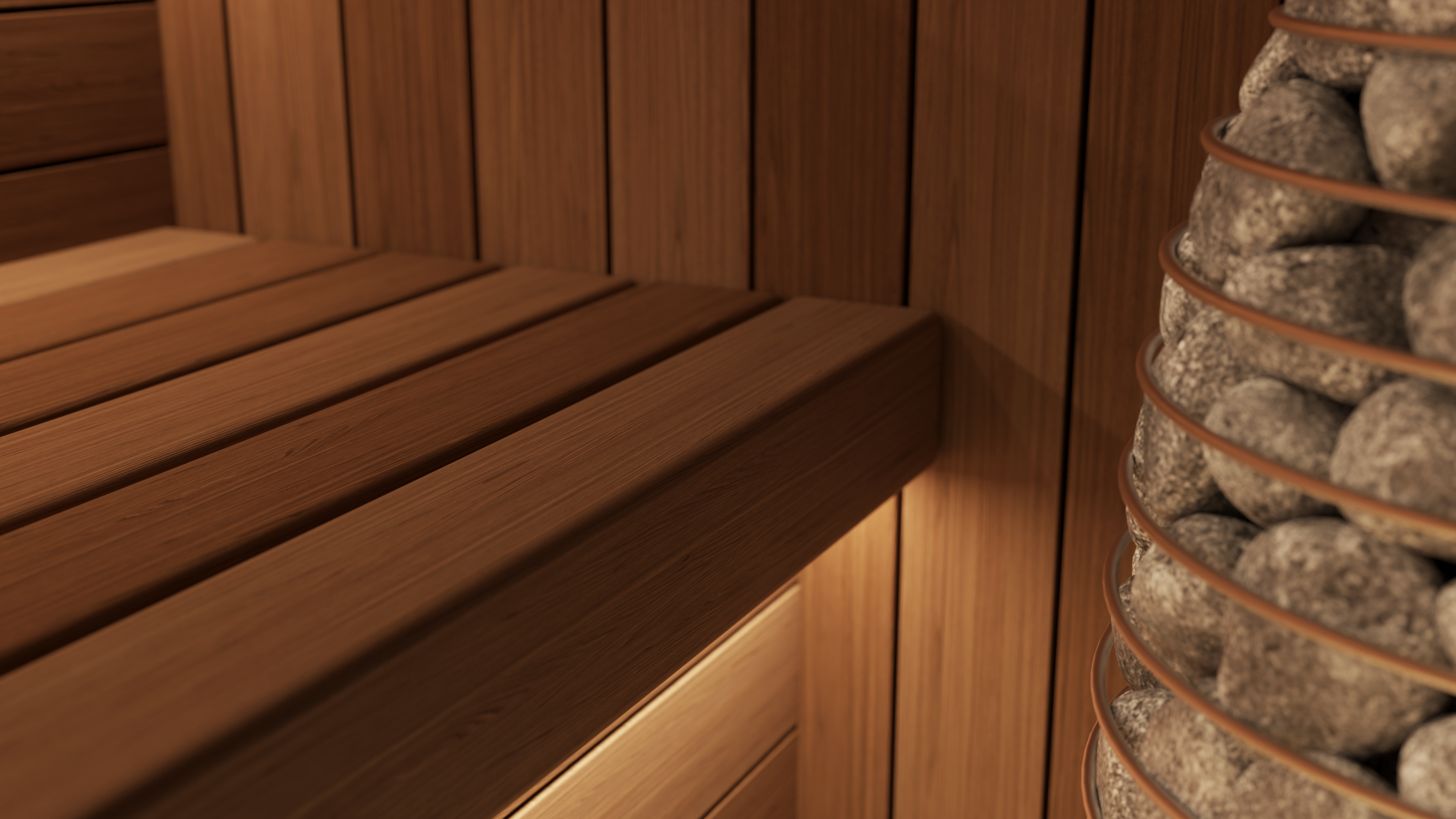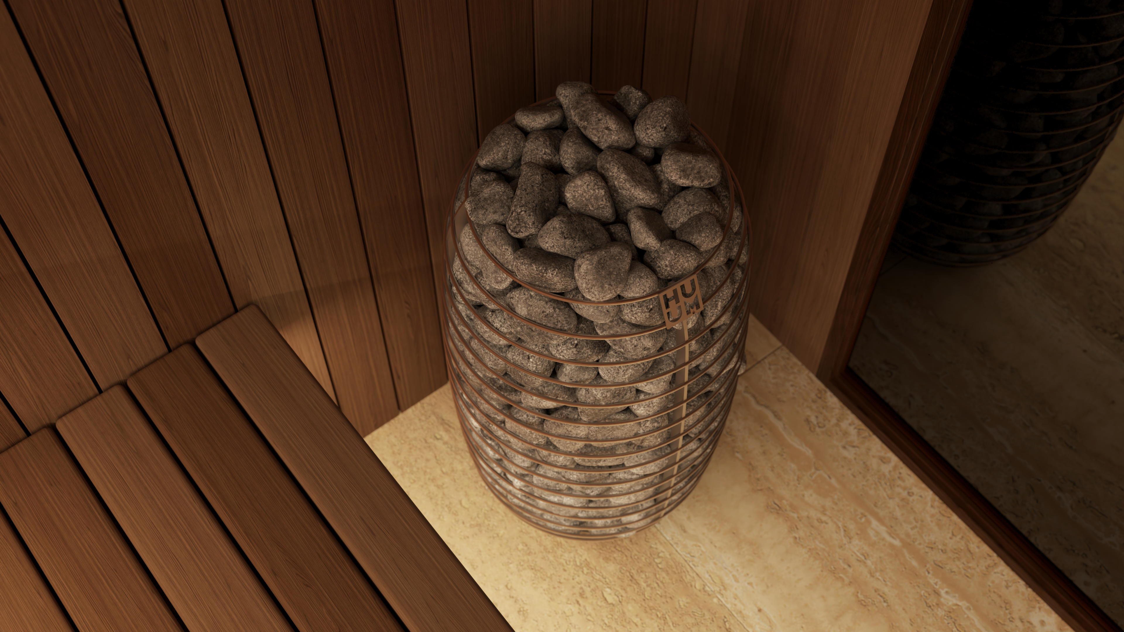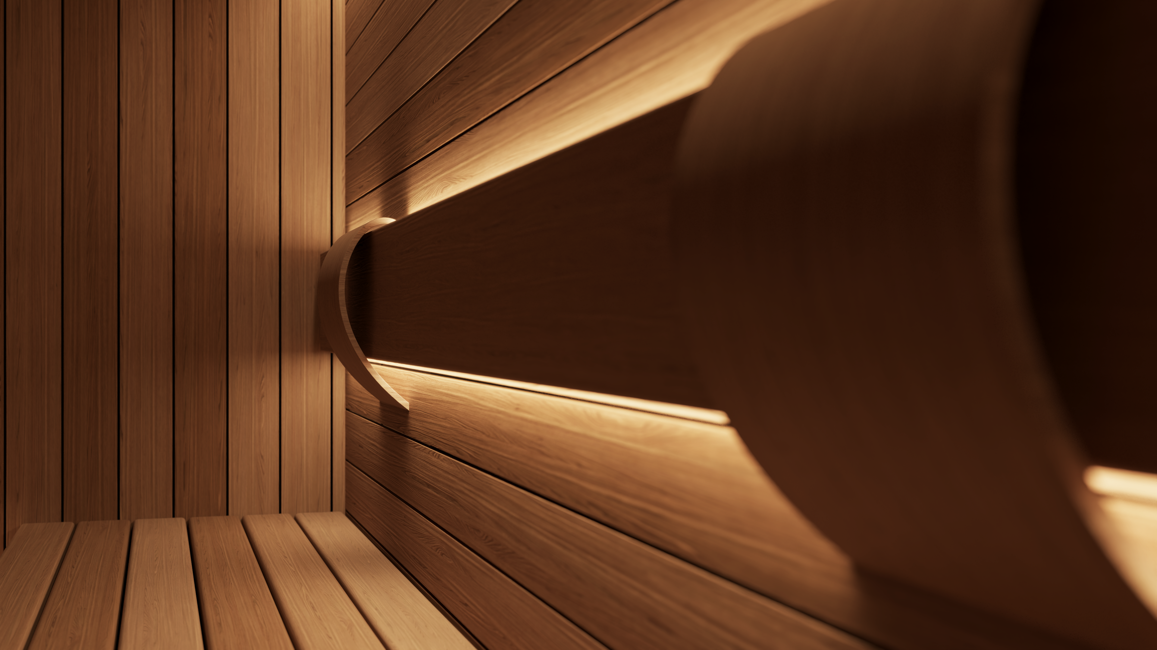 The sauna also incorporates a discreet, state-of-the-art mechanical ventilation system concealed within the walls and benching. Underfoot, a natural stone tiled floor with an integrated drain completes the space, staying true to traditional sauna design principles while maintaining a refined, luxury finish.