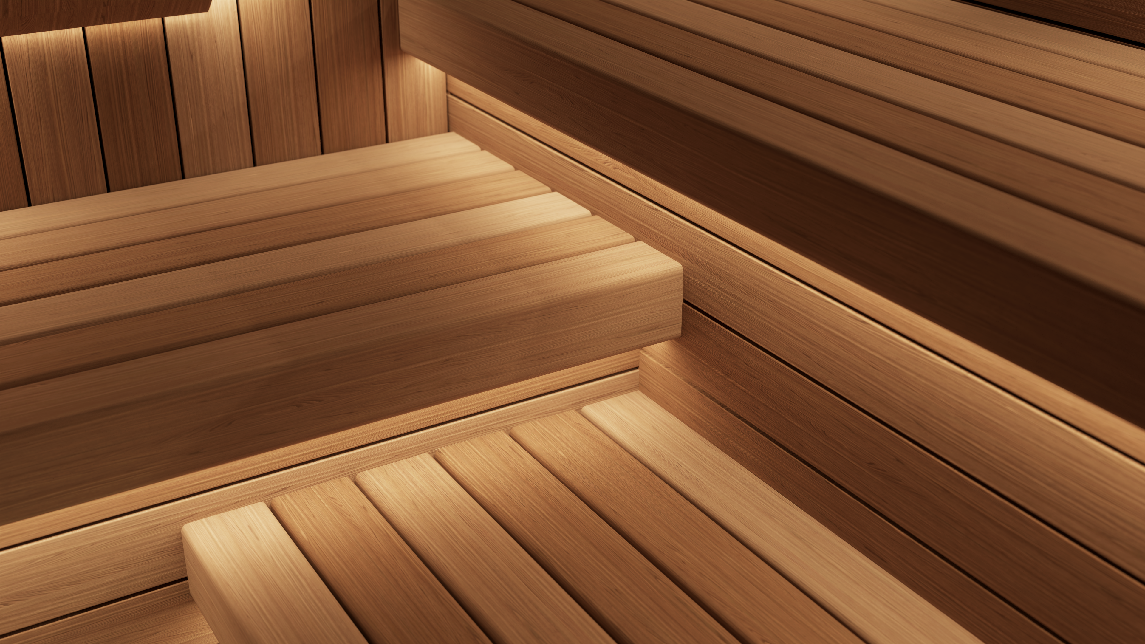 The space measured 2.7m x 2.4m and featured large bespoke glazing to maximise the poolside views and natural light. To make the most of the footprint, we designed a three-tier bench layout, carefully staggered at 200mm intervals to create depth and visual interest while maintaining comfort and usability. The interior was finished in Thermo Aspen, complemented by a KYTE-S ceiling profile to break up the timber lines and add architectural detail overhead.