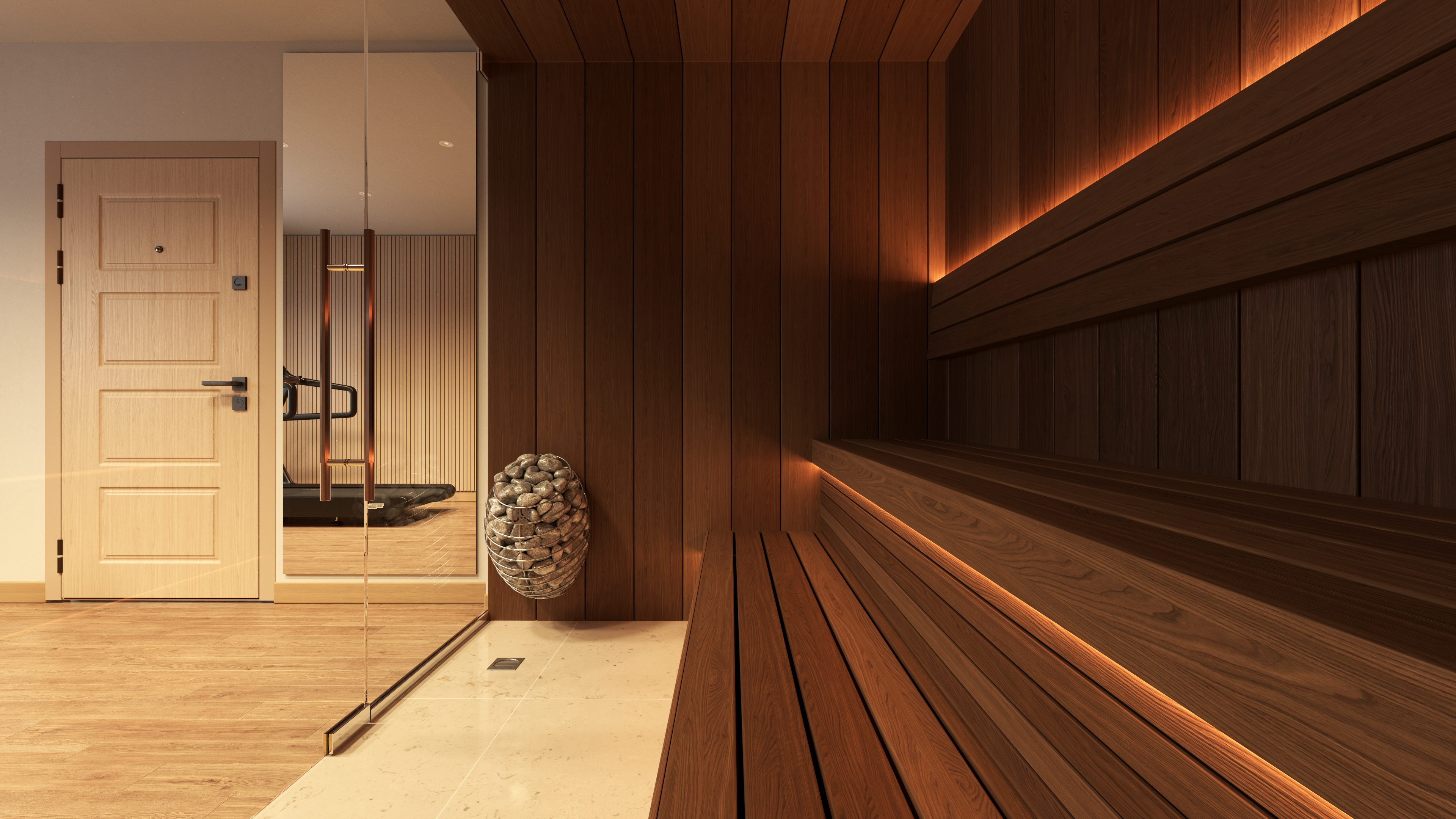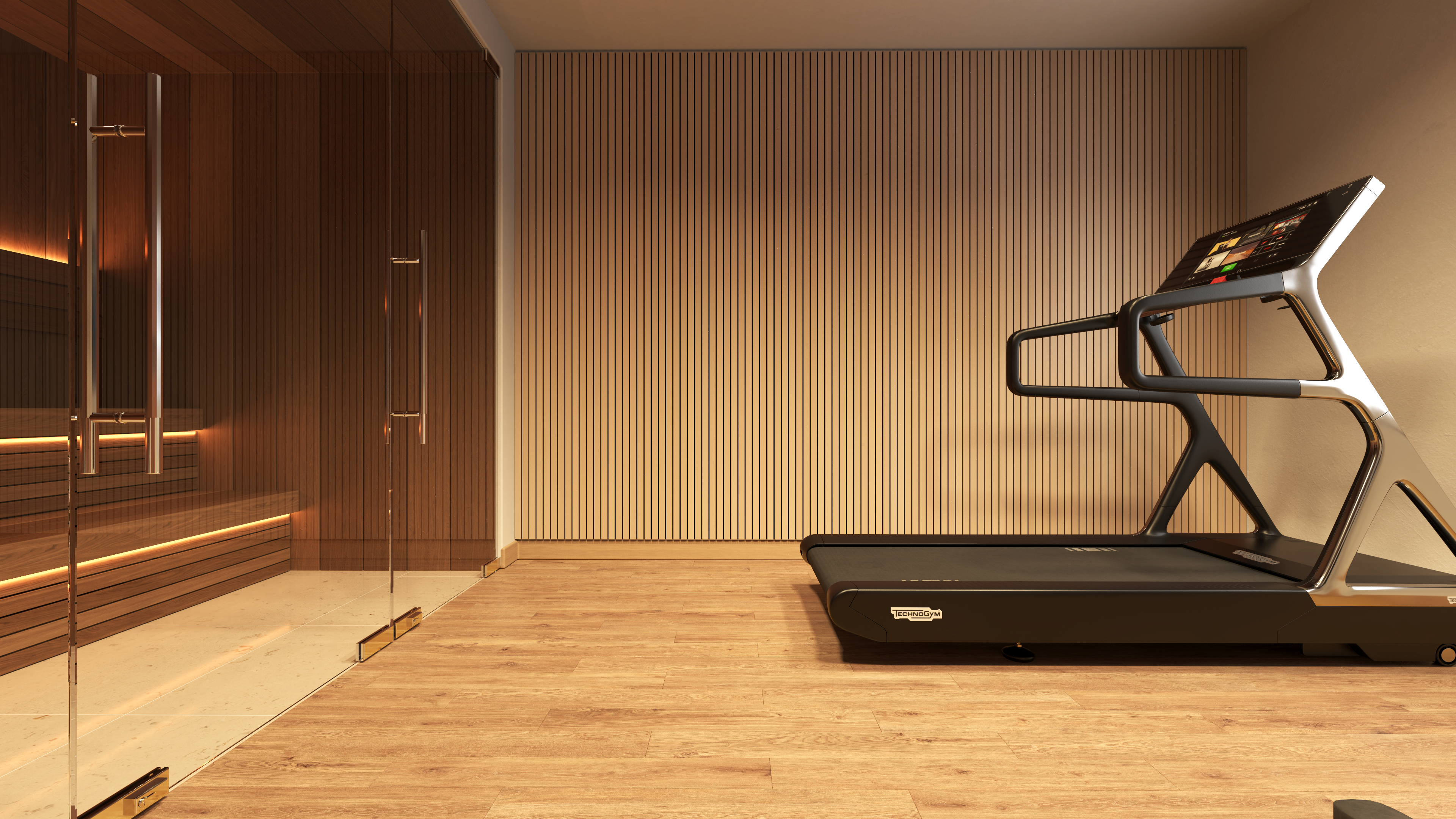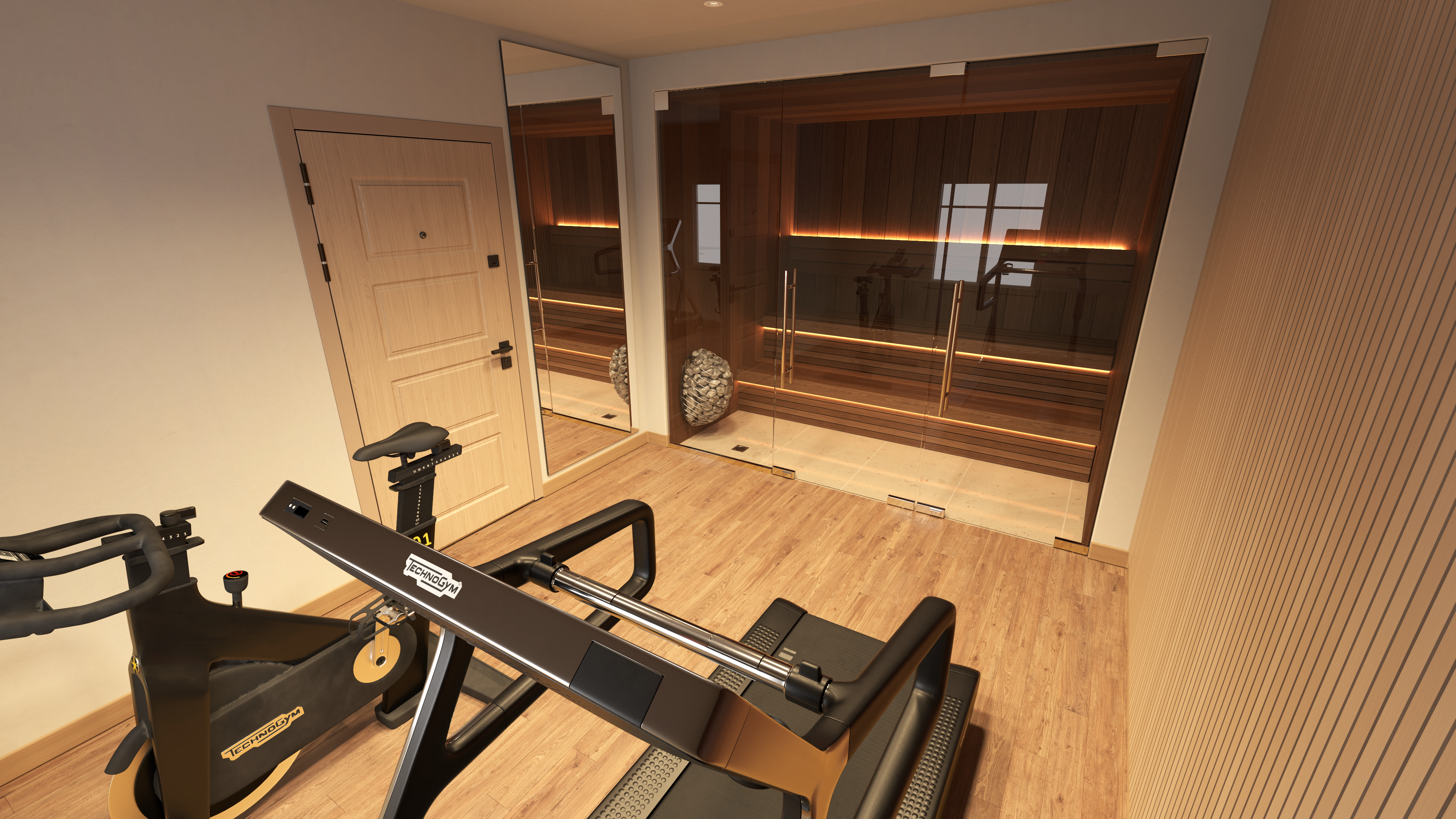 The client specified the fitness equipment based on their personal training preferences, selecting the machines they use most frequently. From that foundation, we shaped the architectural concept and spatial experience, ensuring that the gym and sauna coexist harmoniously within a minimal and refined design language.